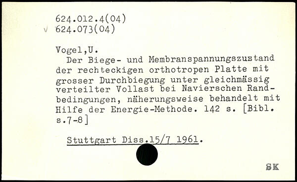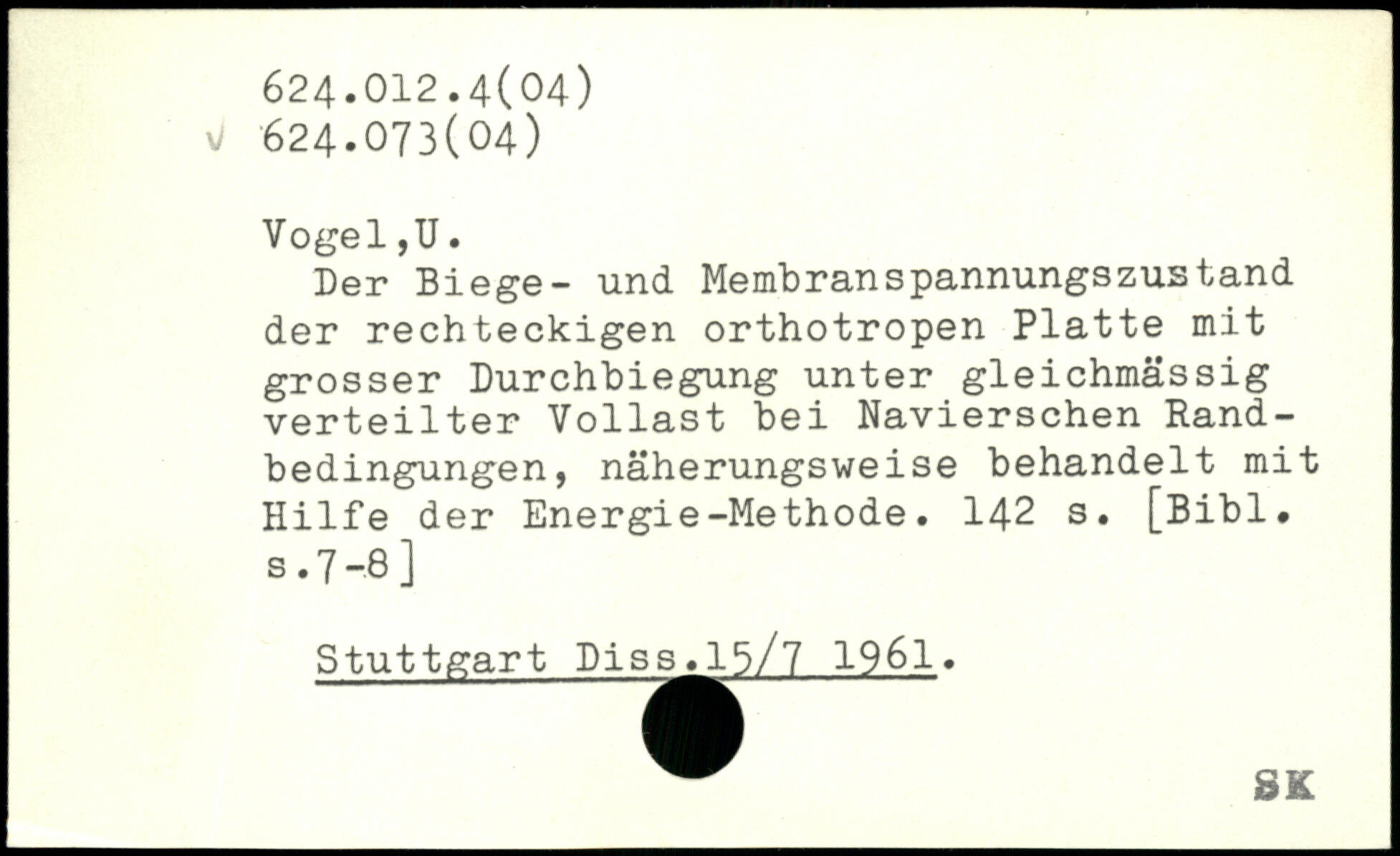 Der Biege- und Membranspannungszustand der rechteckigen orthotropen Platte mit grosser Durchbiegung unter gleichmässig verteilter Vollast bei Navierschen Randbedingungen, näherungsweise behandelt mit Hilfe der Energie-Methode.