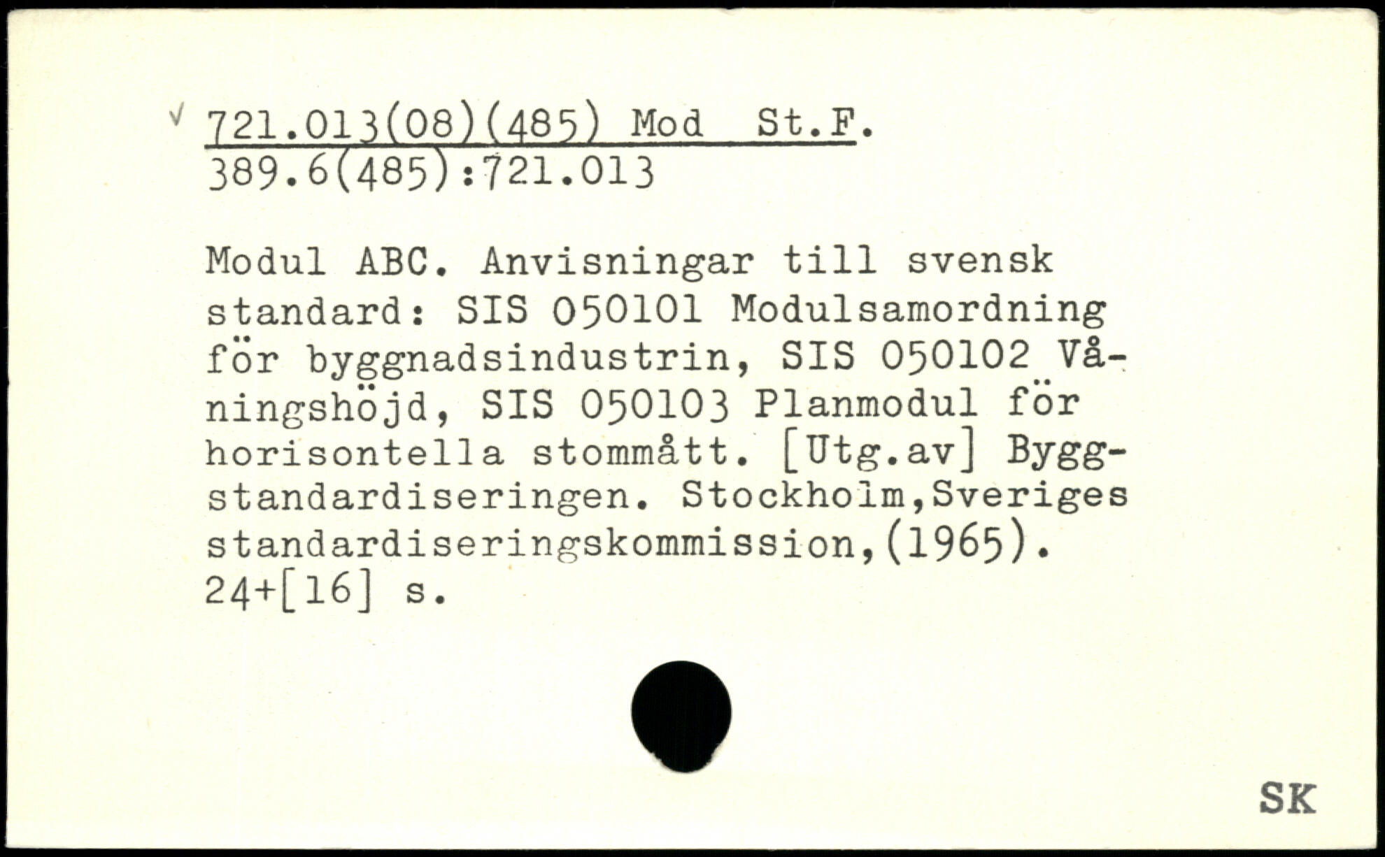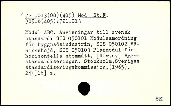 Modul ABC. Anvisningar till svensk standard: SIS 050101 Modulsamordning för byggnadsindustrin, SIS 050102 Vå-ningshojd, SIS 050103 Planmodul för horisontella stommått. [Utg.av] Bygg-standardiseringen. Stockholm,Sveriges standardiseringskommission,(1965). 24+[l6] s.