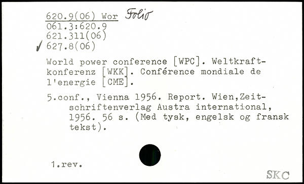 World power conference [WPC]. Weltkraft-konferenz [WKK_. Conference mondiale de 1'energie _ CME_. 5.conf., Vienna 1956. Report.