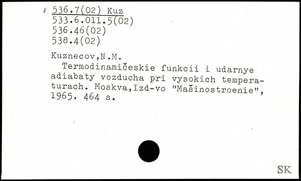 Termodinamiceskie funkcii i udarnye adiabaty vozducha pri vysokich tempera-turach. Moskva,Izd-vo "Masinostroenie", 1965.