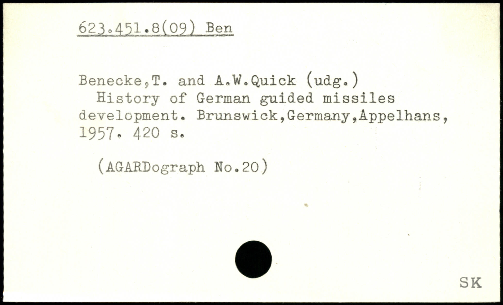 Benecke9T. and A,W,Quick (udg.) History of German guided missiles development. Brunswick,Germany,Åppelhans, 1957. 42O s.