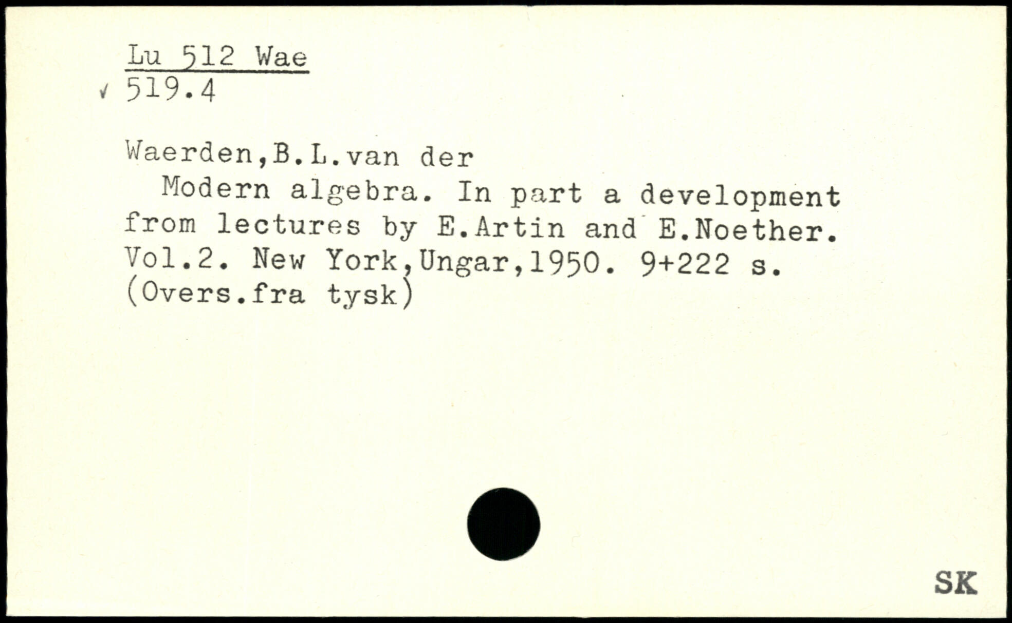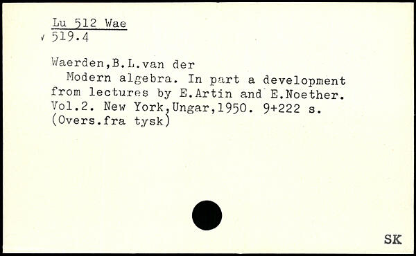 V/aerden, B. L. van der Modern algebra. In part a development from lectures by E.Artin and E.Noether.