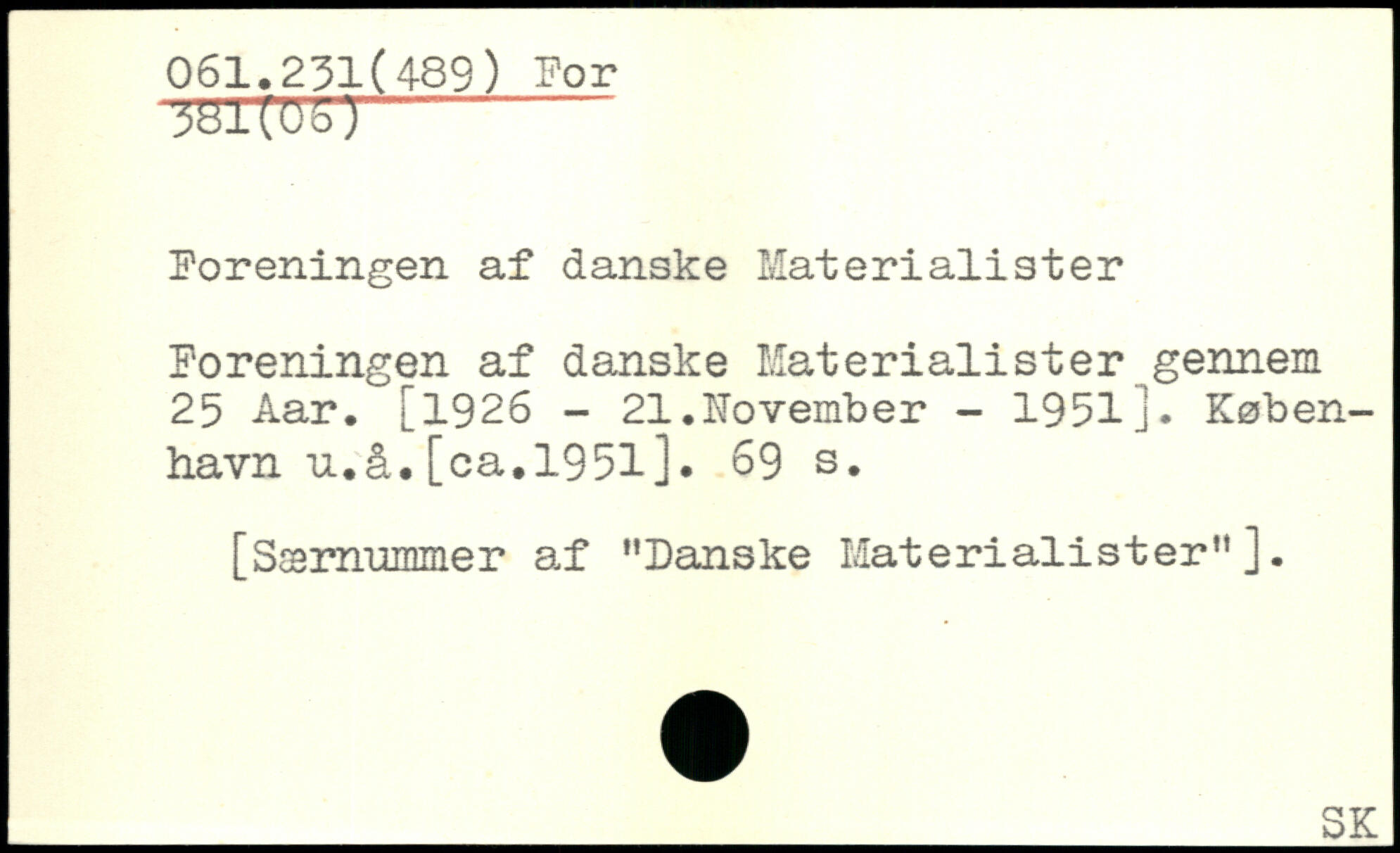 iBiCUSl- Foreningen af danske Materialister Foreningen af danske Materialister gennem 25 Aar. [1926 - 21.November - 1951j. København u.å. [ca. 1951].
