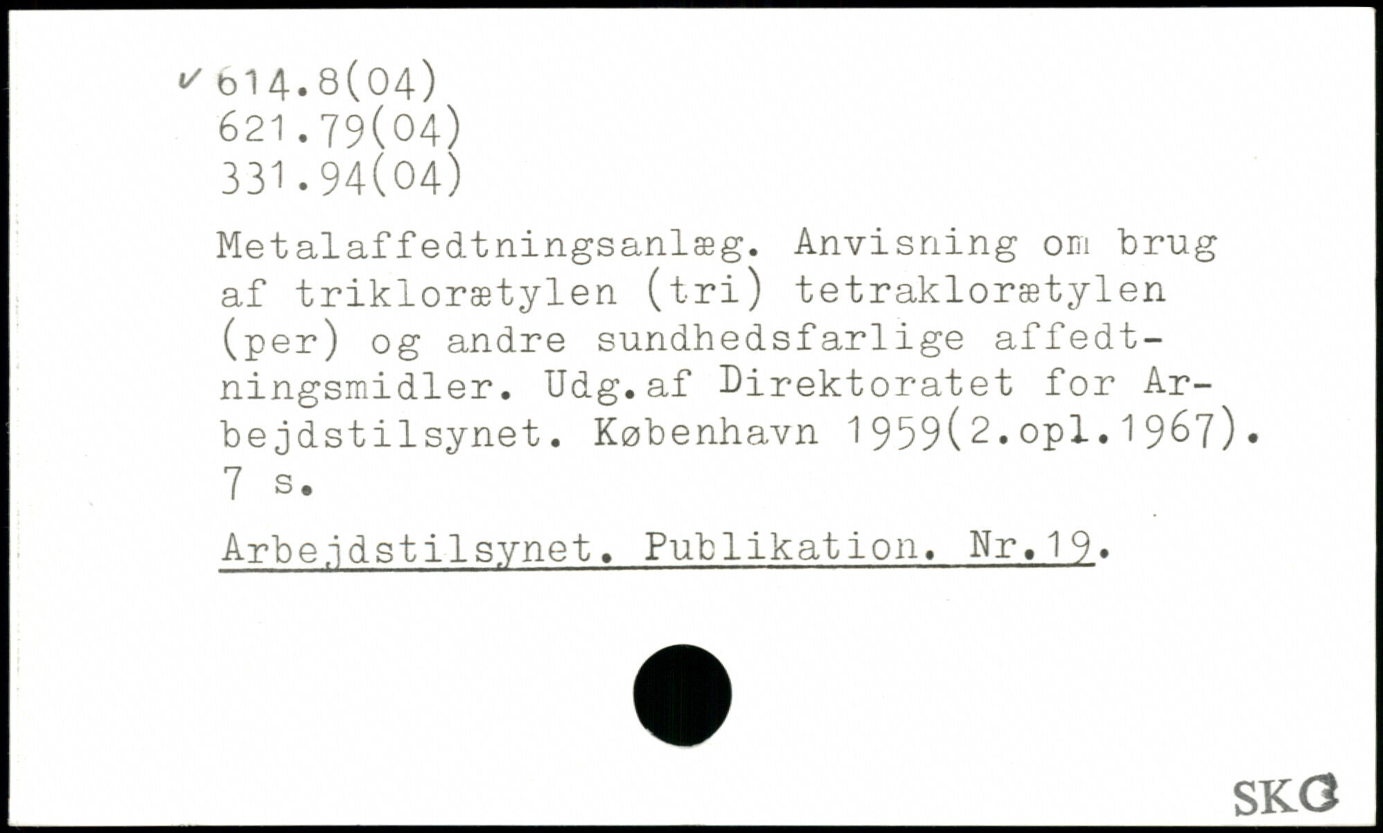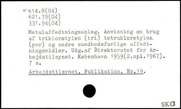Metalaffedtningsanlæg. Anvisning om brug af triklorætylen (tri) tetraklorætylen (per) og andre sundhedsfarlige affedtningsmidler. Udg.af Direktoratet for Arbejdstilsynet. København 19 59(2.opl.19^7).