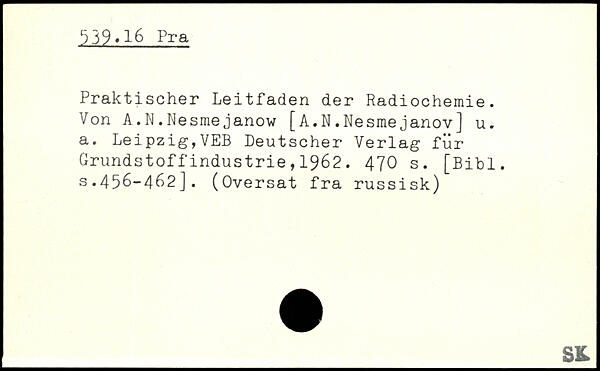 Praktischer Leitfaden der Radiochemie. Von A.N.Nesmejanow [A.N.Nesmejanov] u. a. Leipzig,VEB Deutscher Verlag für Grundstoffindustrie,1962. 47O s.