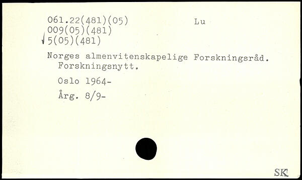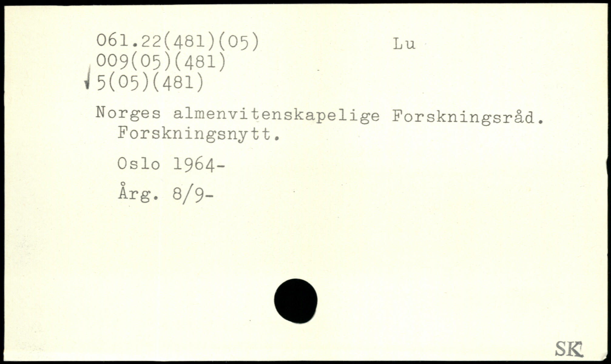 Norges alraenvitenskapelige Forskningsråd. Forskningsnytt. Oslo 1964- 1 Årg. 8/9- _SK