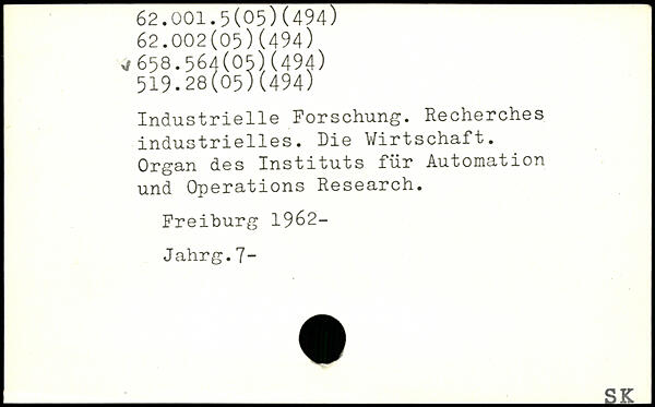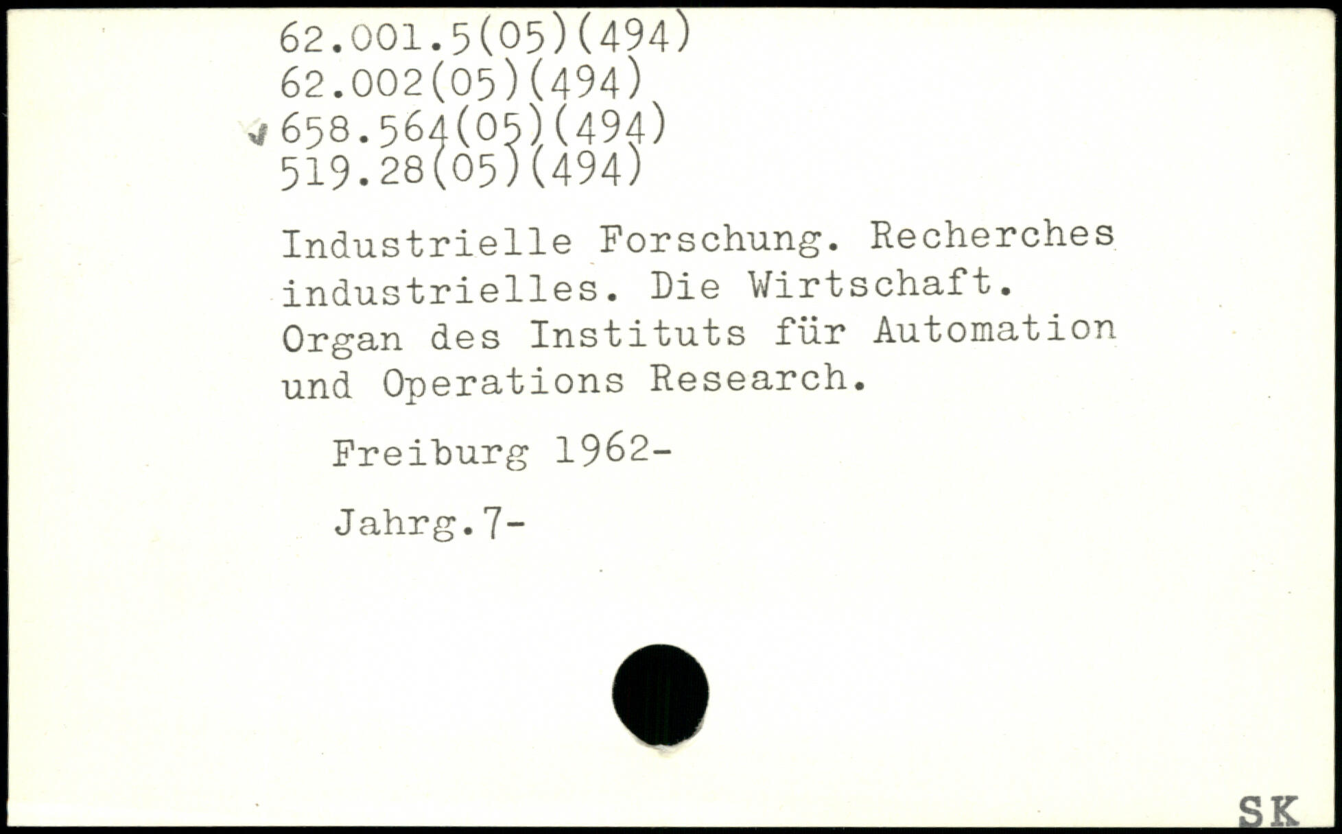 Industrielle Forschung. Recherches industrielles. Die Wirtschaft. Organ des Instituts für Automation und Operations Research. Freiburg 1962- Jahrg.7- _S K