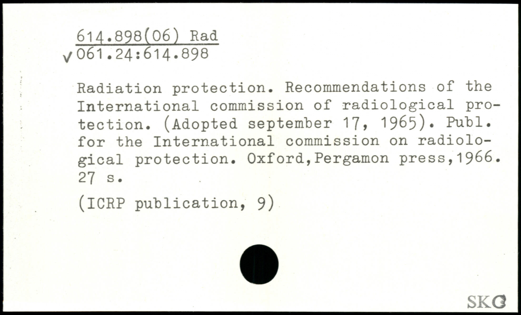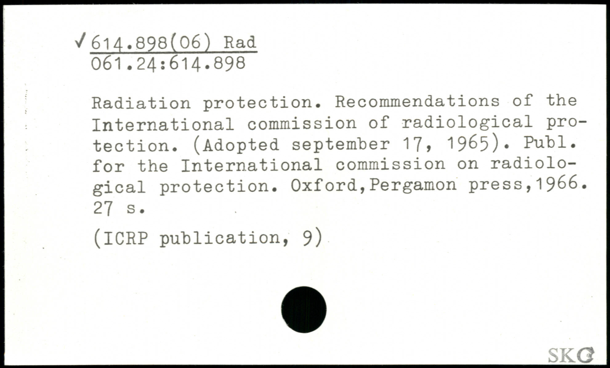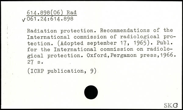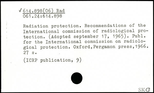 Radiation protection. Recommendations of the International commission of radiological protection. (Adopted september 17, 1965). Publ. for the International commission on radiological protection.
