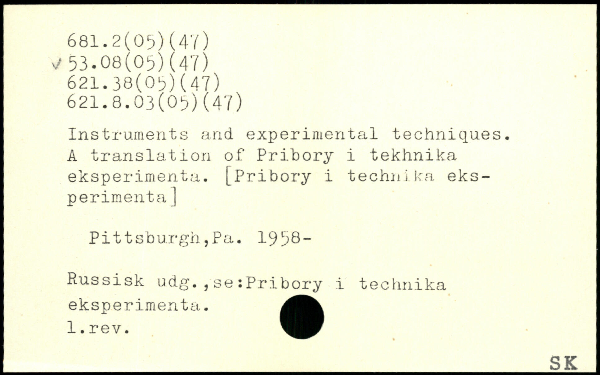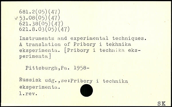 Instruments and experimental techniques. A translation of Pribory i tekhnika eksperimenta. [Pribory i technika eks-perimenta] Pittsburgh,Pa. 1958“ Russisk udg. , se :Pr.ibory .i technika eksperimenta. l.rev. _si;