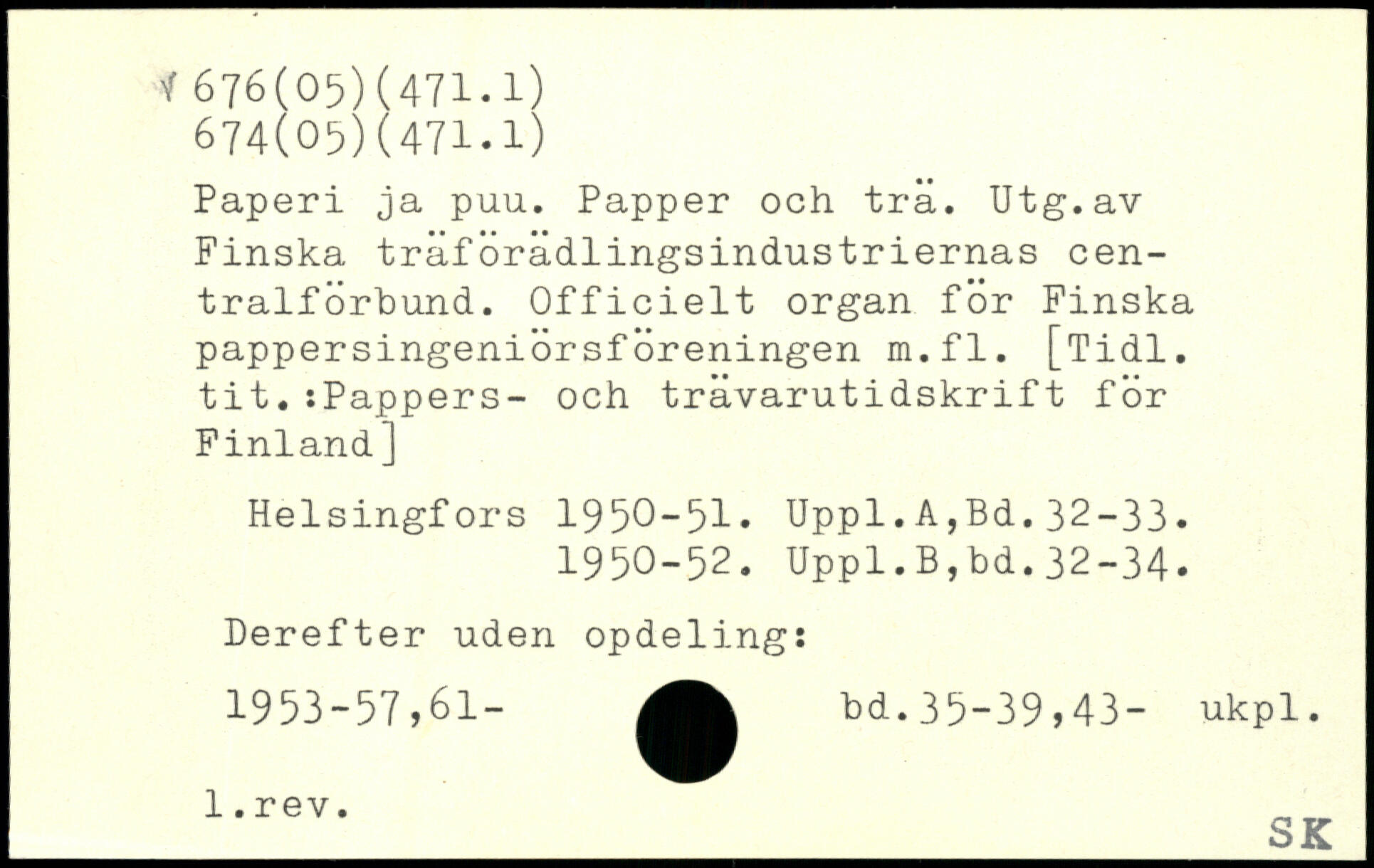 Paperi ja puu. Papper och trä. Utg.av Finska traförädlingsindustriernas centralförbund. Officielt organ för Finska pappersingeniörsföreningen m.fl. [Tidl. tit.:Pappers- och trävarutidskrift för Finland]