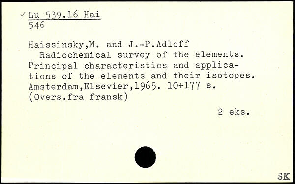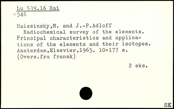 Radiochemical survey of the elements. Principal characteristics and applications of the elements and their isotopes.