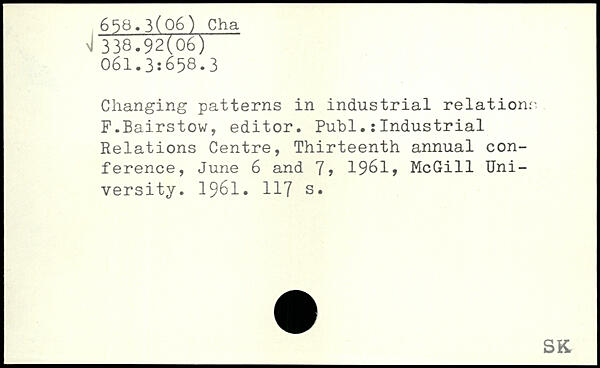 Changing patterns in industrial relations F.Bairstow, editor. Publ.:Industrial Relations Centre, Thirteenth annual conference, June 6 and 7, 1961, McGill University. 1961.
