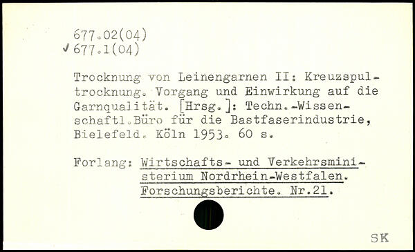 Trocknung von Leinengarnen II: Kreuzspul-trocknungo Vorgang und Einwirkung auf die Garnqualitat. [Hrsg,]: Techn.-Wissen-schaftloBüro für die Bastfaserindustrie, Bielefeldr.