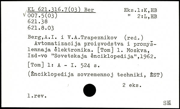 Avtomatizacija proizvodstva i promys-lennaja elektronika. [Tom] 1. Moskva, Izd-vo "Sovetskaja énciklopedija",1962. [Tom] 1: A - I.
