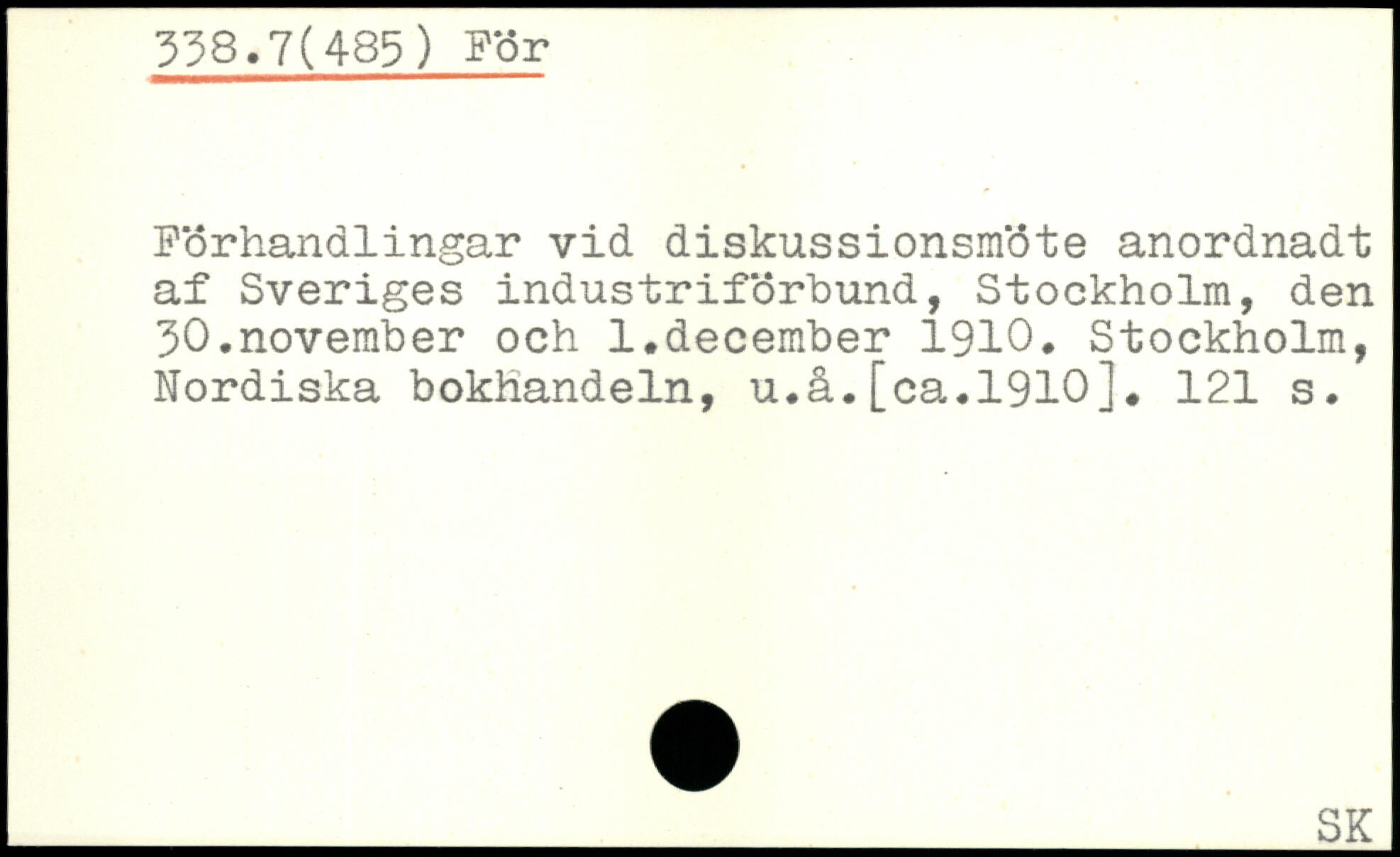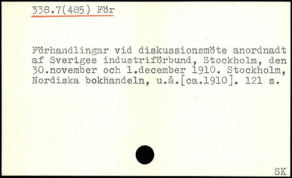 Förhandlingar vid diskussionsmöte anordnadt af Sveriges industriförbund, Stockholm, den 30.november och l.december 1910. Stockholm, Nordiska bokhandeln, u.å.[ca.1910].