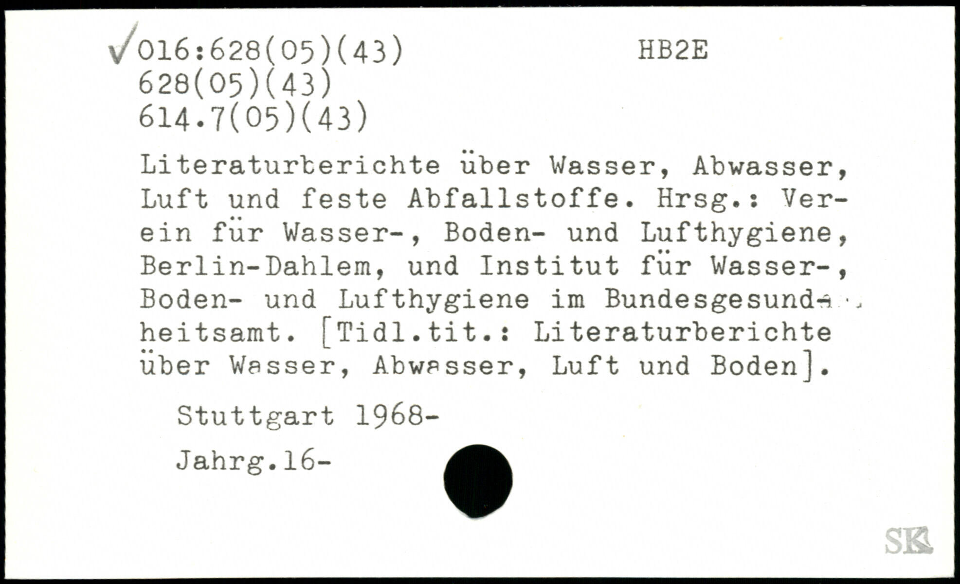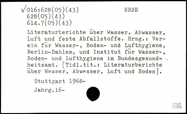 Literaturberichte über Wasser, Abwasser, Luft und feste Abfallstoffe. Hrsg.: Verein für Wasser-, Boden- und Lufthygiene, Berlin-Dahlem, und Institut für Wasser-, Boden- und Lufthygiene im Bundesgesunde heitsamt. [Tidl.tit.: Literaturberichte über Wasser, Abwasser, Luft und Boden].