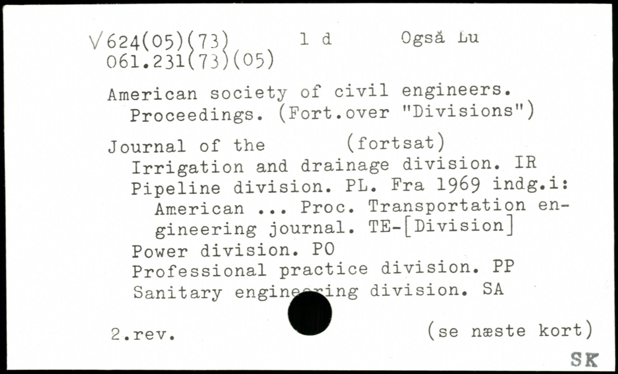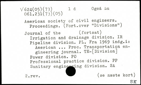 American society of civil engineers. Proceedings. (Fort.over "Divisions") Journal of the (fortsat) Irrigation and drainage division. IR Pipeline division. PL. Fra 19^9 indg.i: American ... Proc. Transportation engineering journal. TE-[Division] Power division. PO Professional practice division. PP Sanitary engin^A^.ng division. SA