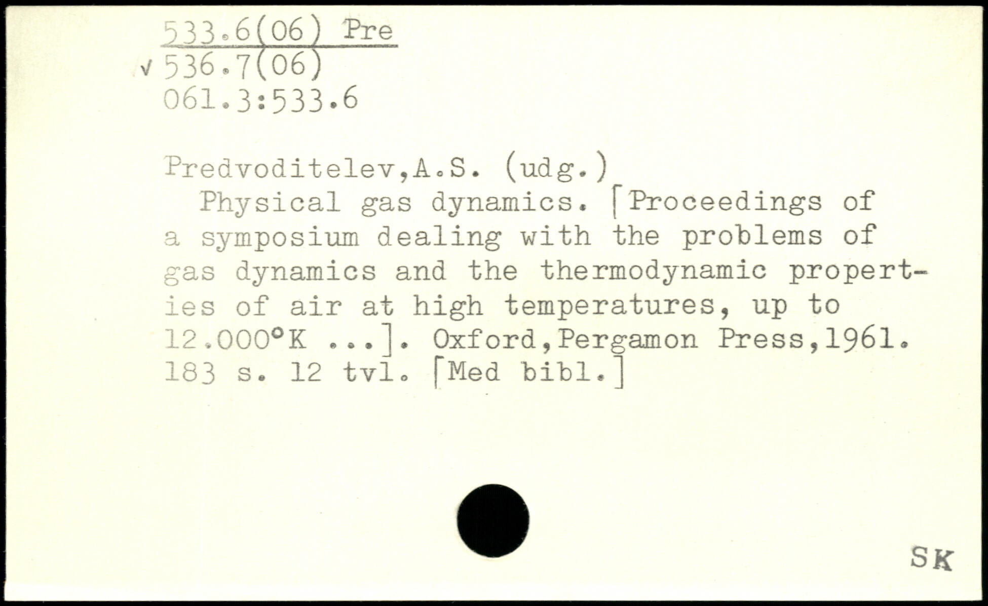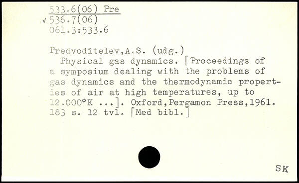 ?redvoditelev,AoS. (udg.) Physical gas dynamics, [proceedings of a symposium dealing with the problems of gas dynamics and the thermodynamic properties of air at high temperatures, up to 12.000.K ...].