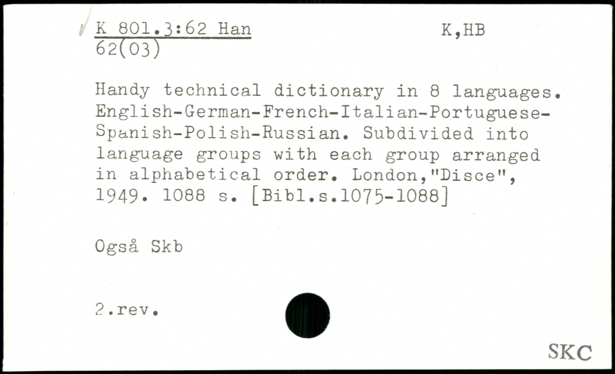 Handy technical dictionary in 8 languages. English-German-French-Italian-Portuguese-Spanish-Polish-Russian. Subdivided into language groups with each group arranged in alphabetical order. London,"Disce", 1949.