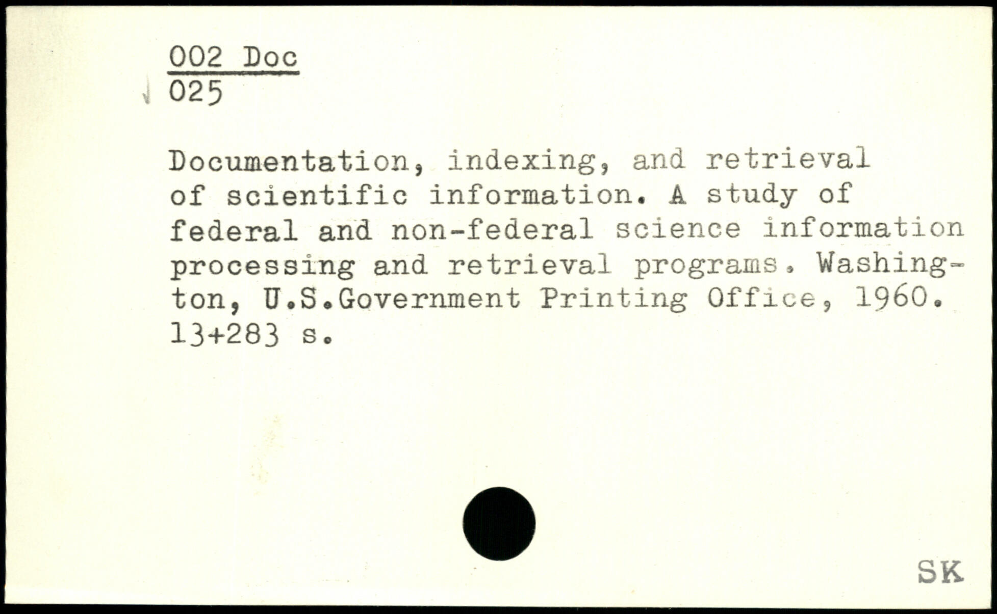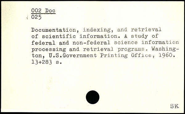 Documentation, indexing, and retrieval of scientific information. A study of federal and non-federal science information processing and retrieval programs, Washington, U.S.Government Printing Office, 1960.