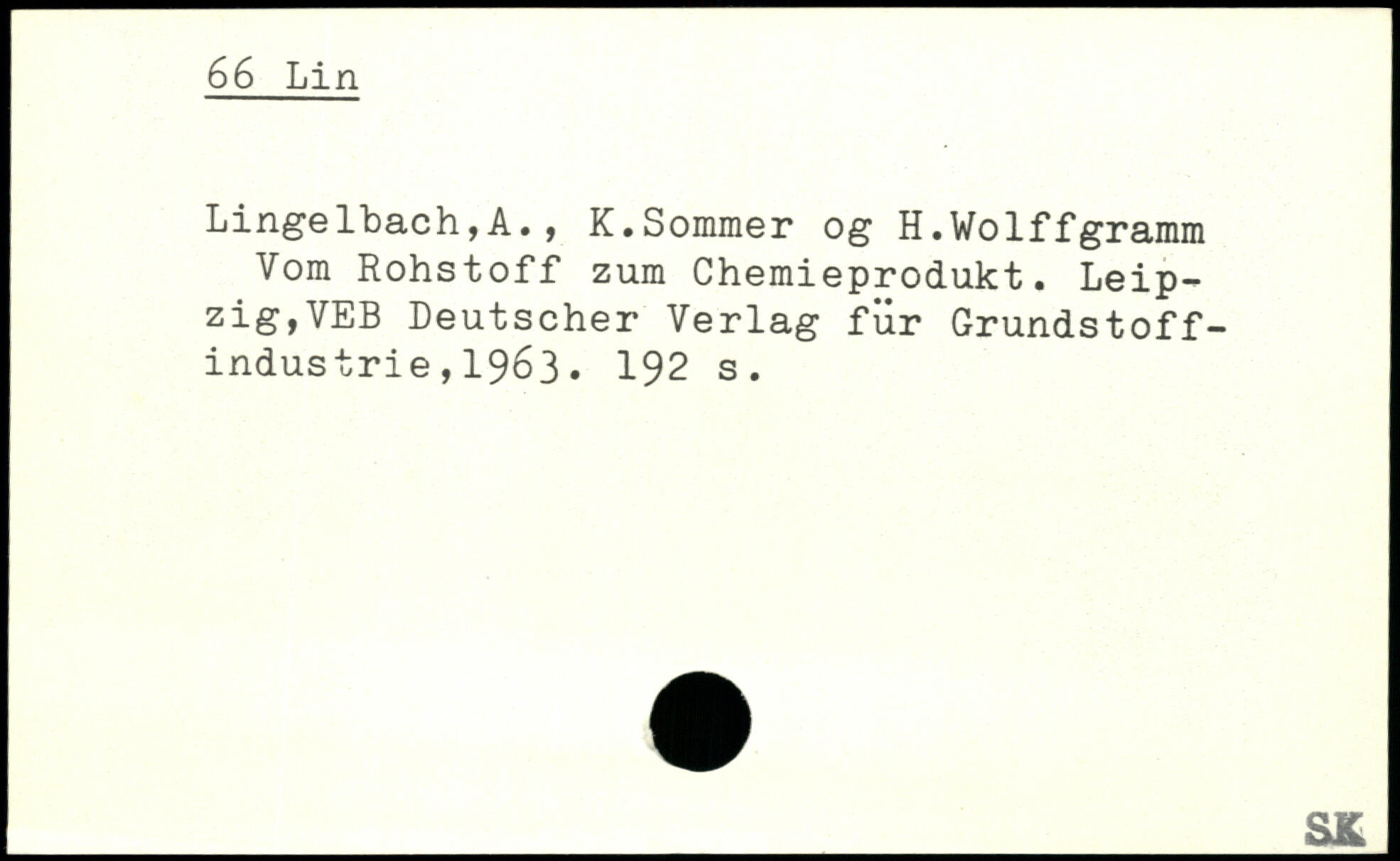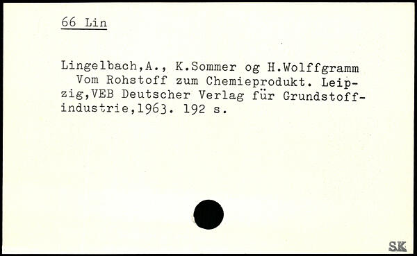 Lingelbach,A., K.Sommer og H.Wolffgramm Vom Rohstoff zum Chemieprodukt. Leipzig,VEB Deutscher Verlag für Grundstoffindus trie,1963.