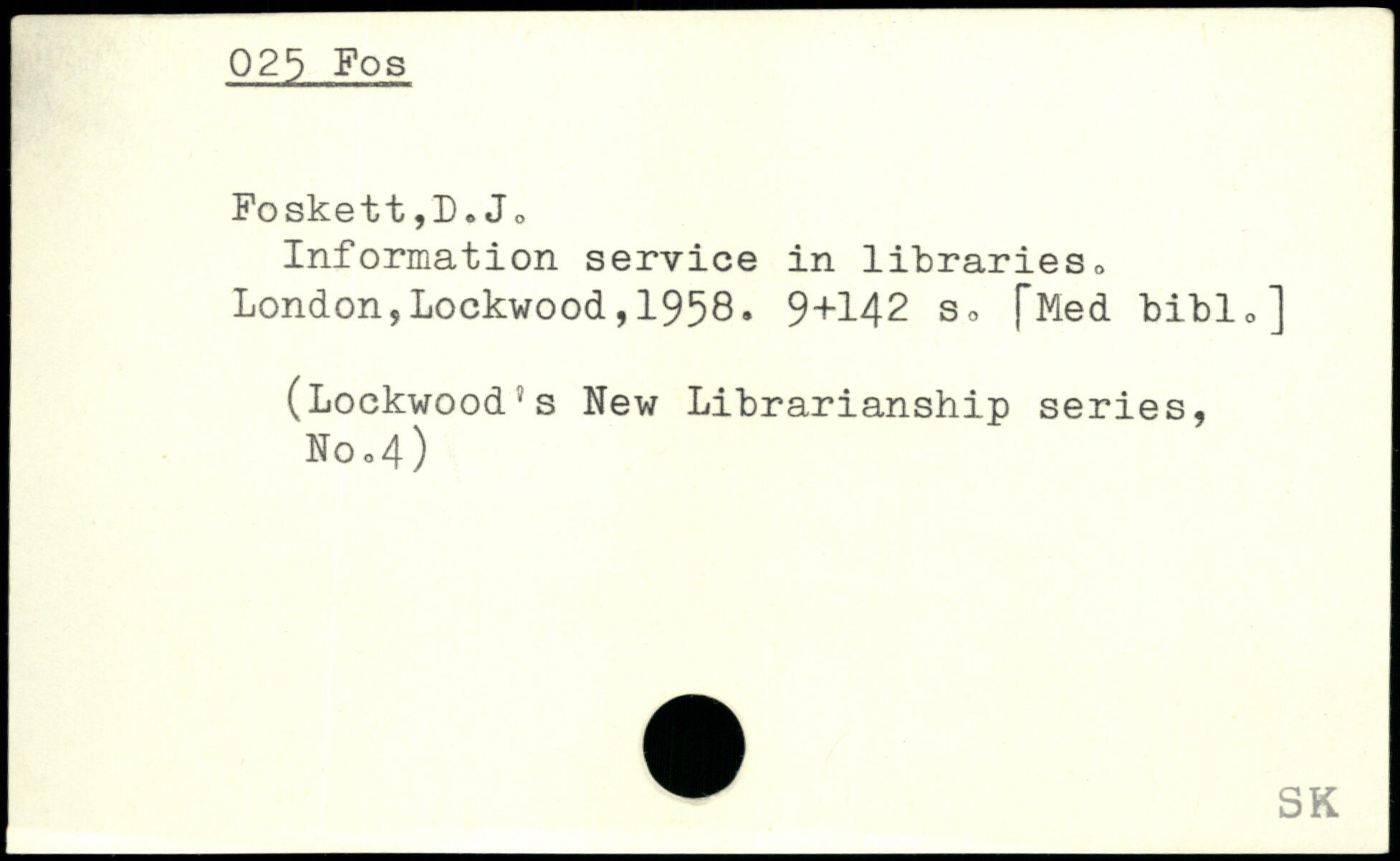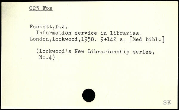 Information service in libraries, London,Lockwood,1958. 9+142 s, [Med bibl,] (Lockwood’s New Librarianship series, Noo4)
