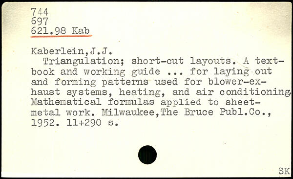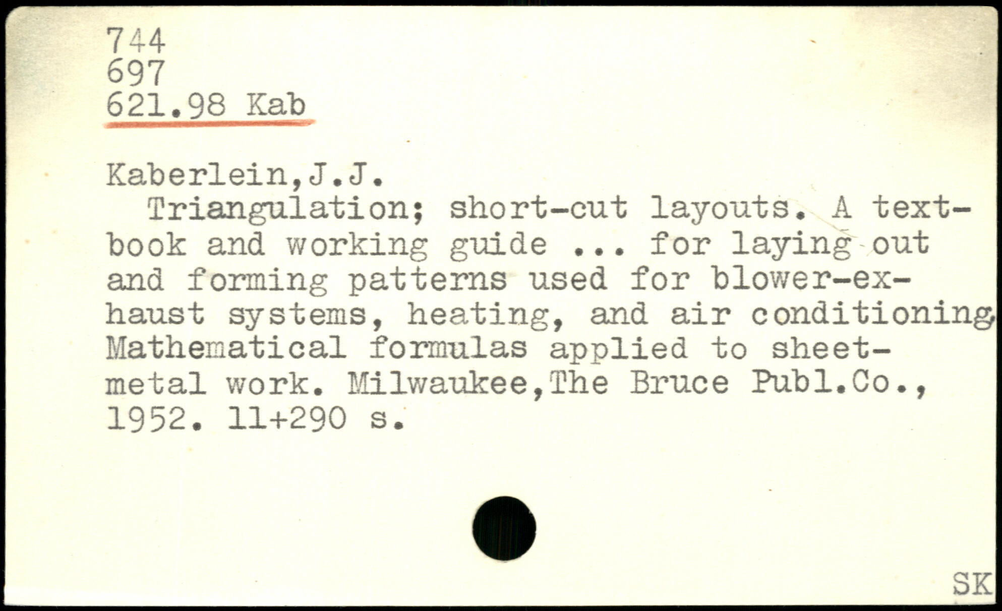 Triangulation; short-cut layouts. A textbook and working guide ... for laying out and forming patterns used for blower-exhaust systems, heating, and air conditioning Mathematical formulas applied to sheet-metal work. Milwaukee,The Bruce Publ.Co., 1952.