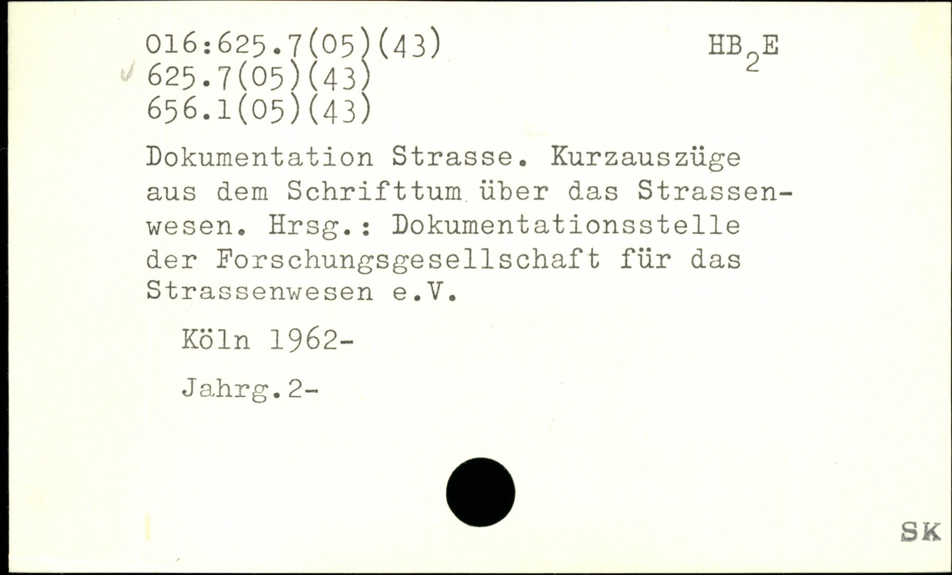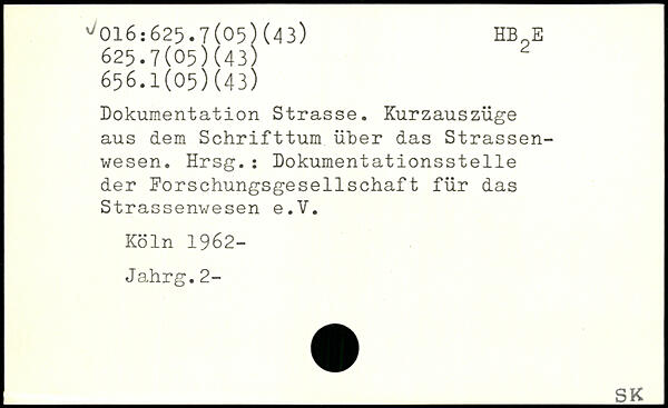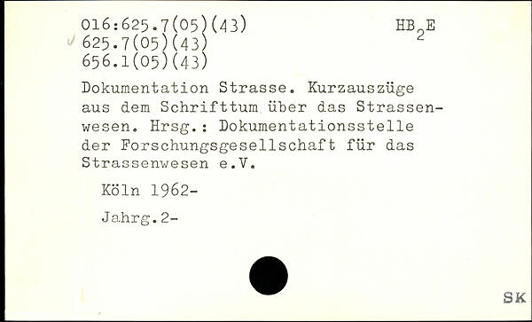 Dokumentation Strasse. Kurzauszüge aus dem Schrifttum über das Strassen-wesen. Hrsg.: Dokumentationsstelle der Forschungsgesellschaft für das Strassenwesen e.V.