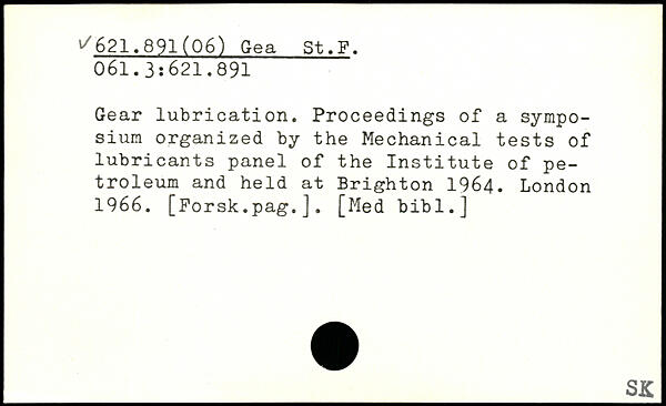 Gear lubrication. Proceedings of a symposium organized by the Mechanical tests of lubricants panel of the Institute of petroleum and held at Brighton 1964.