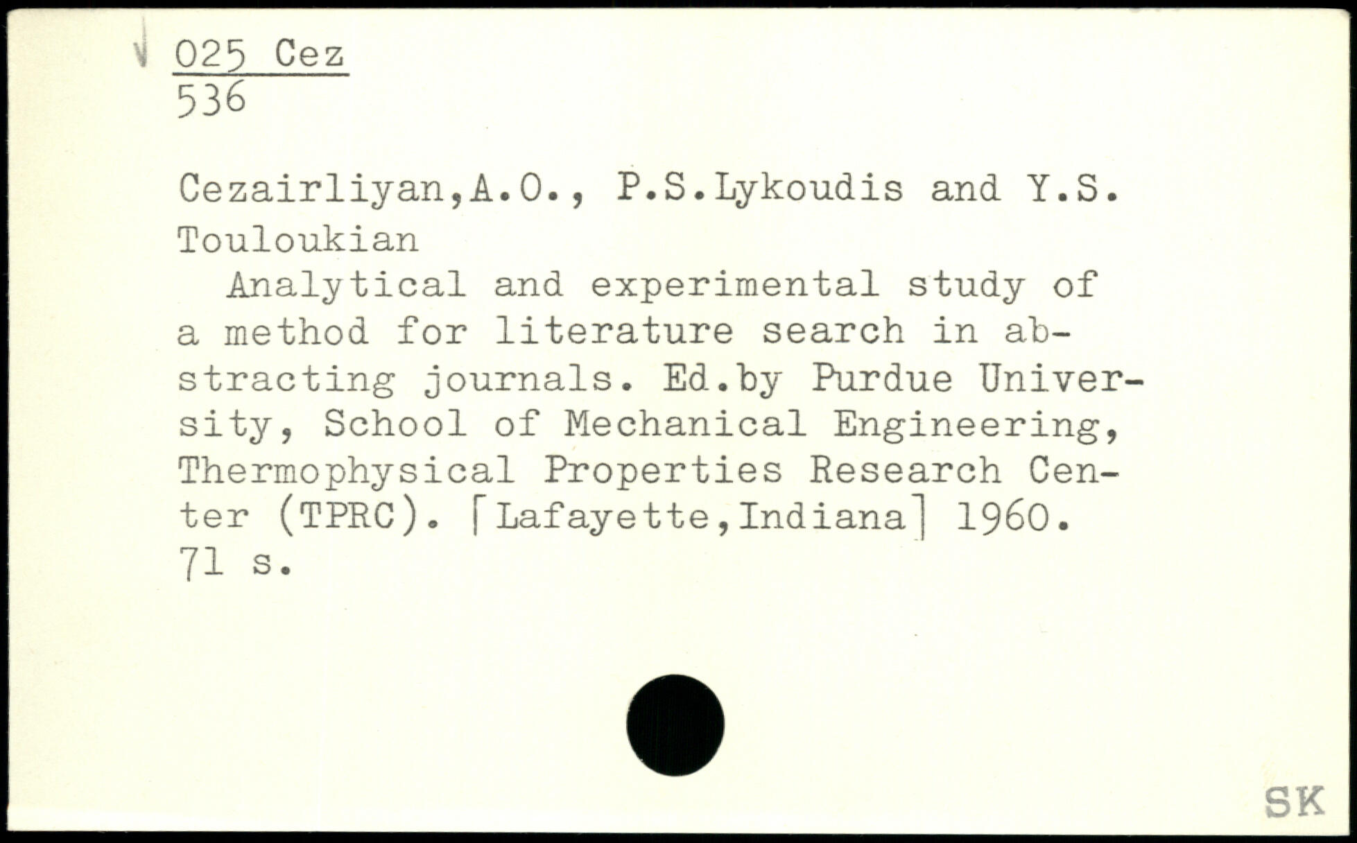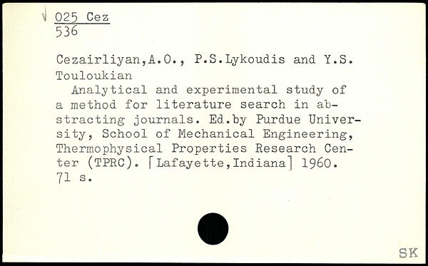 Cezairliyan,A.0., P.S.Lykoudis and Y.S. Touloukian Analytical and experimental study of a method for literature search in abstracting journals. Ed.by Purdue University, School of Mechanical Engineering, Thermophysical Properties Research Center (TPRC). j~ Lafayette, Indiana] 1960.