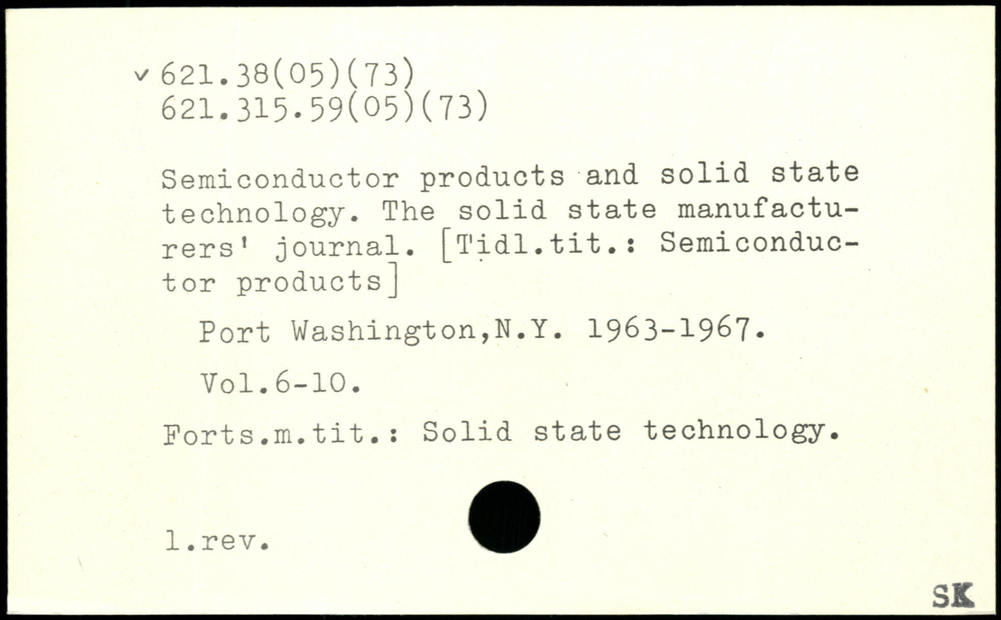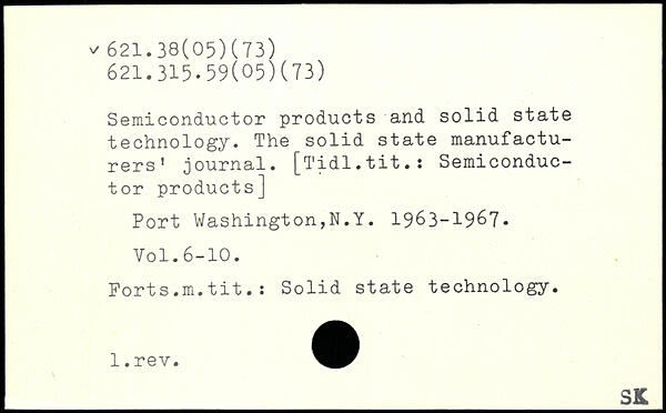 Semiconductor products and solid stats technology. The solid state manufacturers’ journal. [Tidl.tit.î Semiconductor products] Port Washington,N.Y. 1963-1967. Yol.6-10. Forts.m.tit.: Solid state technology.