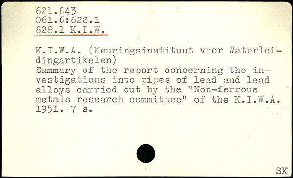 K.I.W.A. (Keuringsinstituut voor Waterlei-d ingart ike1en) Summary of the report concerning the investigations into pipes of lead and lead alloys carried out by the "Non-ferrous metals research committee" of the K.I.W.A. 1951.
