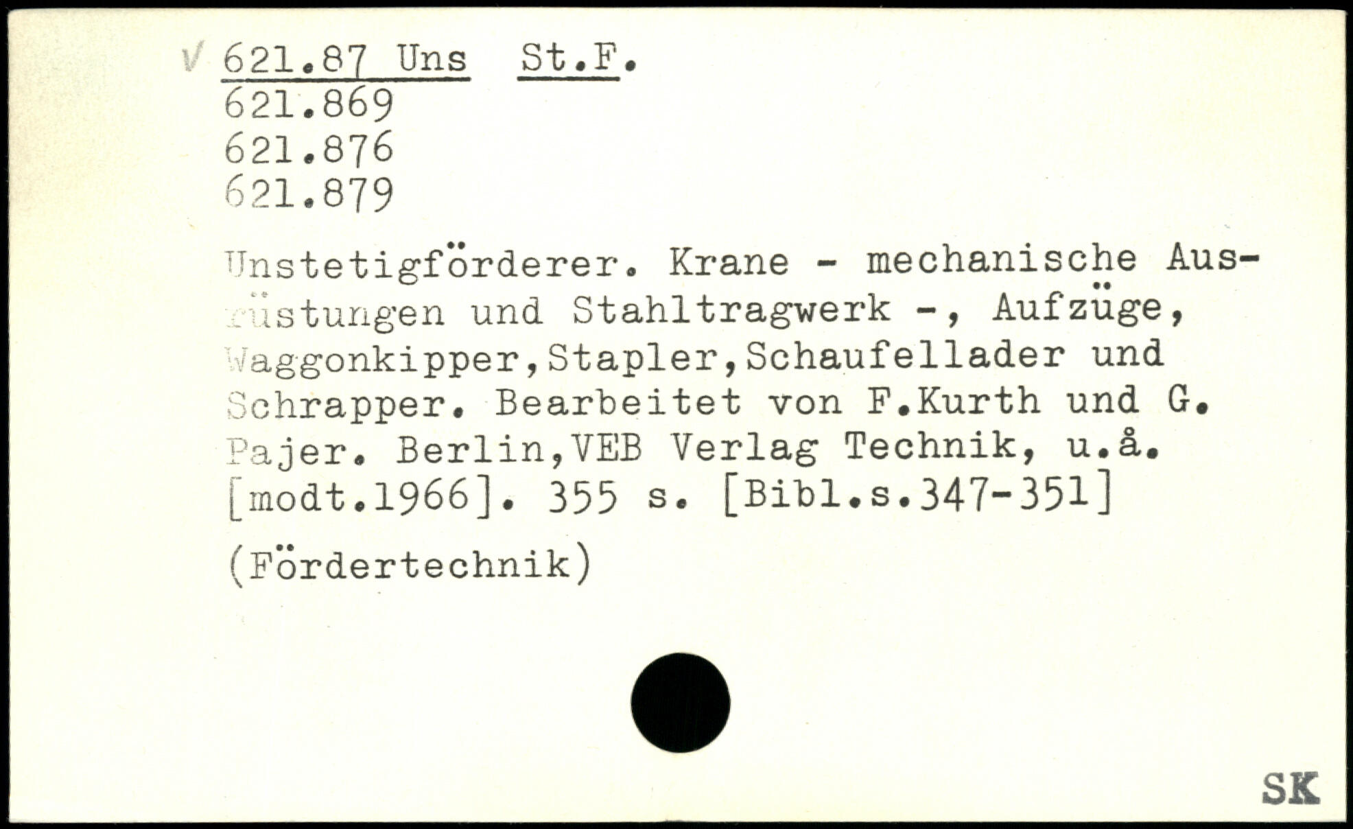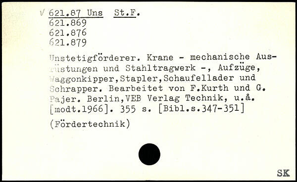 Bnstetigforderer. Krane - mechanische Auslastungen und Stahltragwerk -, Aufzüge, Waggonkipper,Stapler,Schaufellader und Schrapper. Bearbeitet von F.Kurth und G, Pajer. Berlin,VEB Verlag Technik, u.ä.