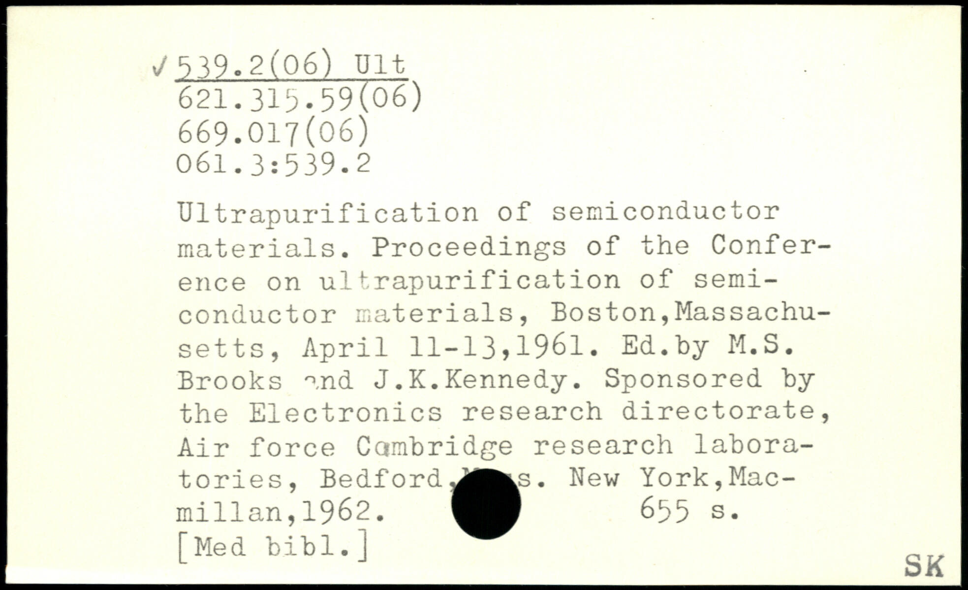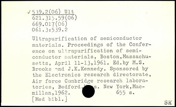 Ultrapurification of semiconductor materials. Proceedings of the Conference on ultrapurification of semiconductor materials, Boston,Massachusetts, April 11-13j1961. Ed.by M.S. Brooks and J.K.Kennedy. Sponsored by the Electronics research directorate, Air force Cambridge research laboratories, BedfordJ|^s.