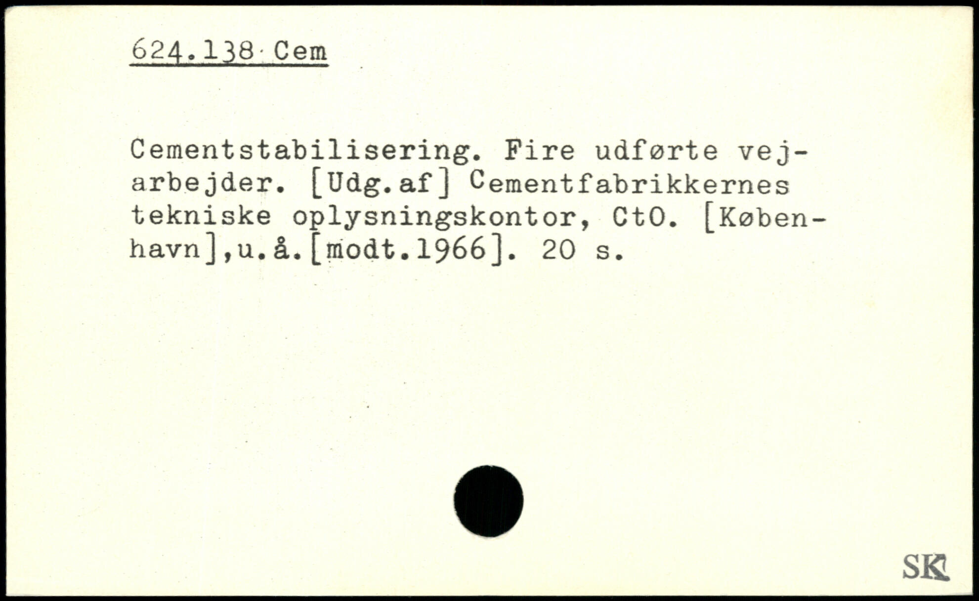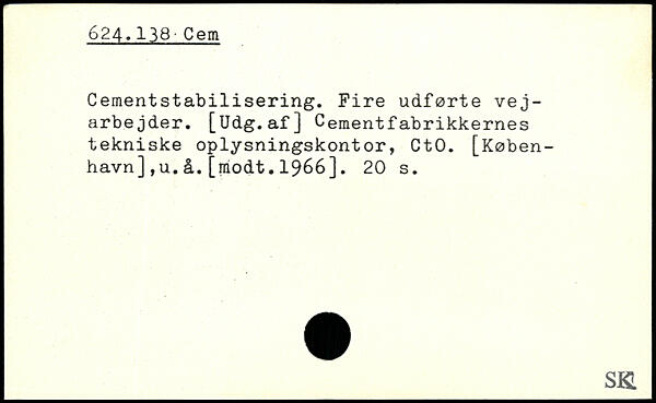 Cement stabilisering. Fire udførte vejarbejder. [Udg.af] Cementfabrikkernes tekniske oplysningskontor, CtO. [København] ,u.å.[modt.1966].