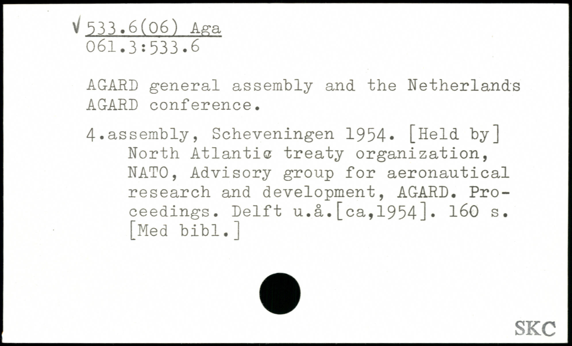 AGARD general assembly and the Netherlands AGARD conference. 4.assembly, Scheveningen 1954. [Held by] North Atlantic treaty organization, NATO, Advisory group for aeronautical research and development, AGARD. Proceedings. Delft u.a.[ca,1954].