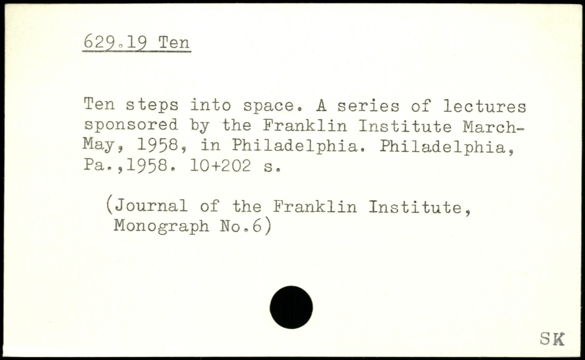 Ten steps into space. A series of lectures sponsored by the Franklin Institute March-May, 1958? in Philadelphia.