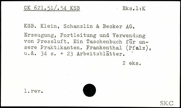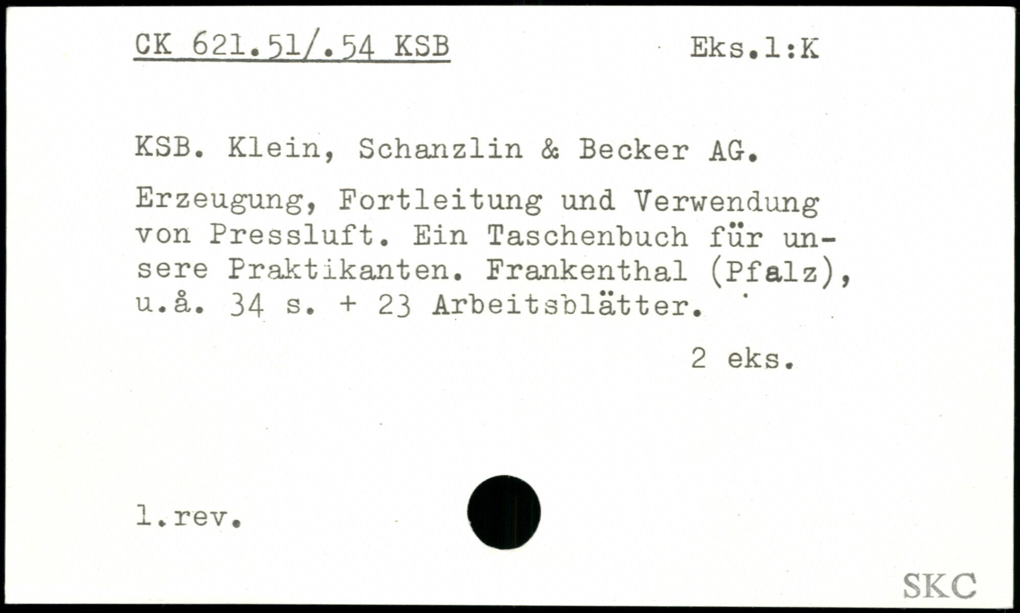 KSB. Klein, Schanzlin & Becker AG. Erzeugung, Fortleitung und Verwendung von Pressluft. Ein Taschenbuch für unsere Praktikanten. Frankenthal (Pfalz), u.ä.
