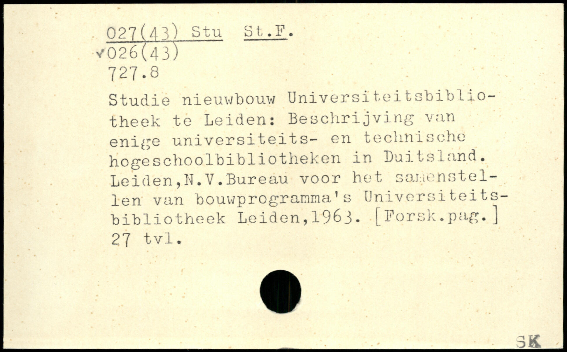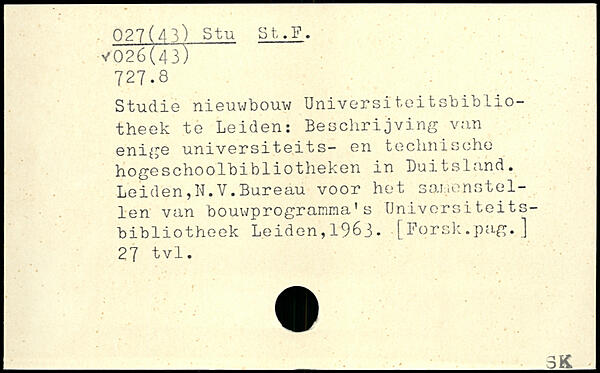 Studie nieuwbouw Universiteitsbiblio-theek te Leiden: Beschrijving van enige universiteits- en technische hogeschoolbibliotheken in Luitsland. Leiden,N.V.Bureau voor het saiMensteilen van bouwprogramma,s Universiteits-bibliotheek Leiden,1963- [Forsk.pag.] 27 tvl. | 3iC