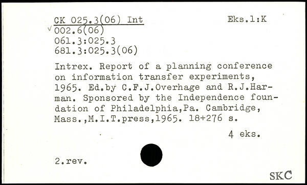 Intrex. Report of a planning conference on information transfer experiments, 1965. Ed."by C .F. J. Overhage and R.J.Harman. Sponsored by the Independence foundation of Philadelphia,Pa.
