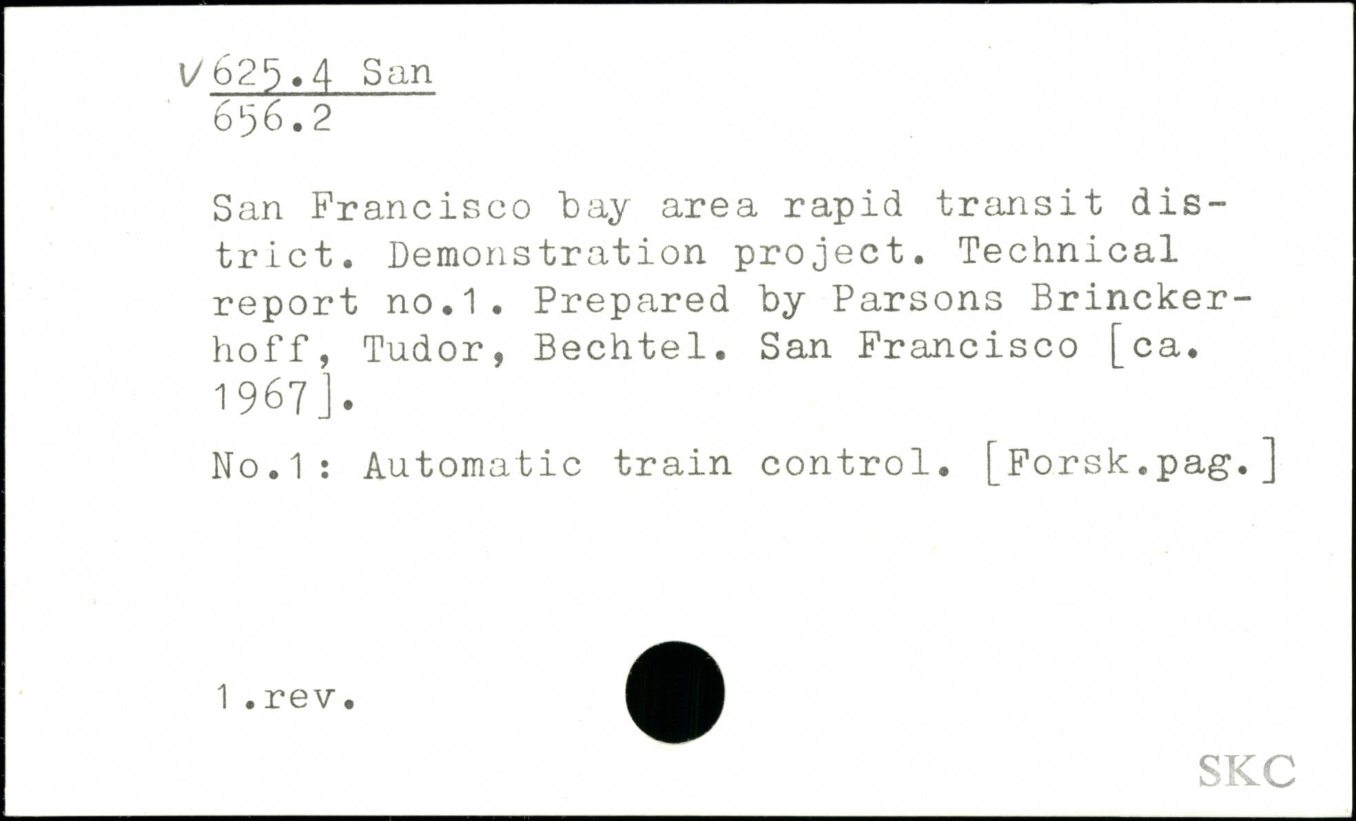 San Francisco bay area rapid transit district. Demonstration project. Technical report no.1. Prepared by Parsons Brincker-hoff, Tudor, Bechtel. San Francisco [ca. 1967]. No.1: Automatic train control. [Forsk.pag.]