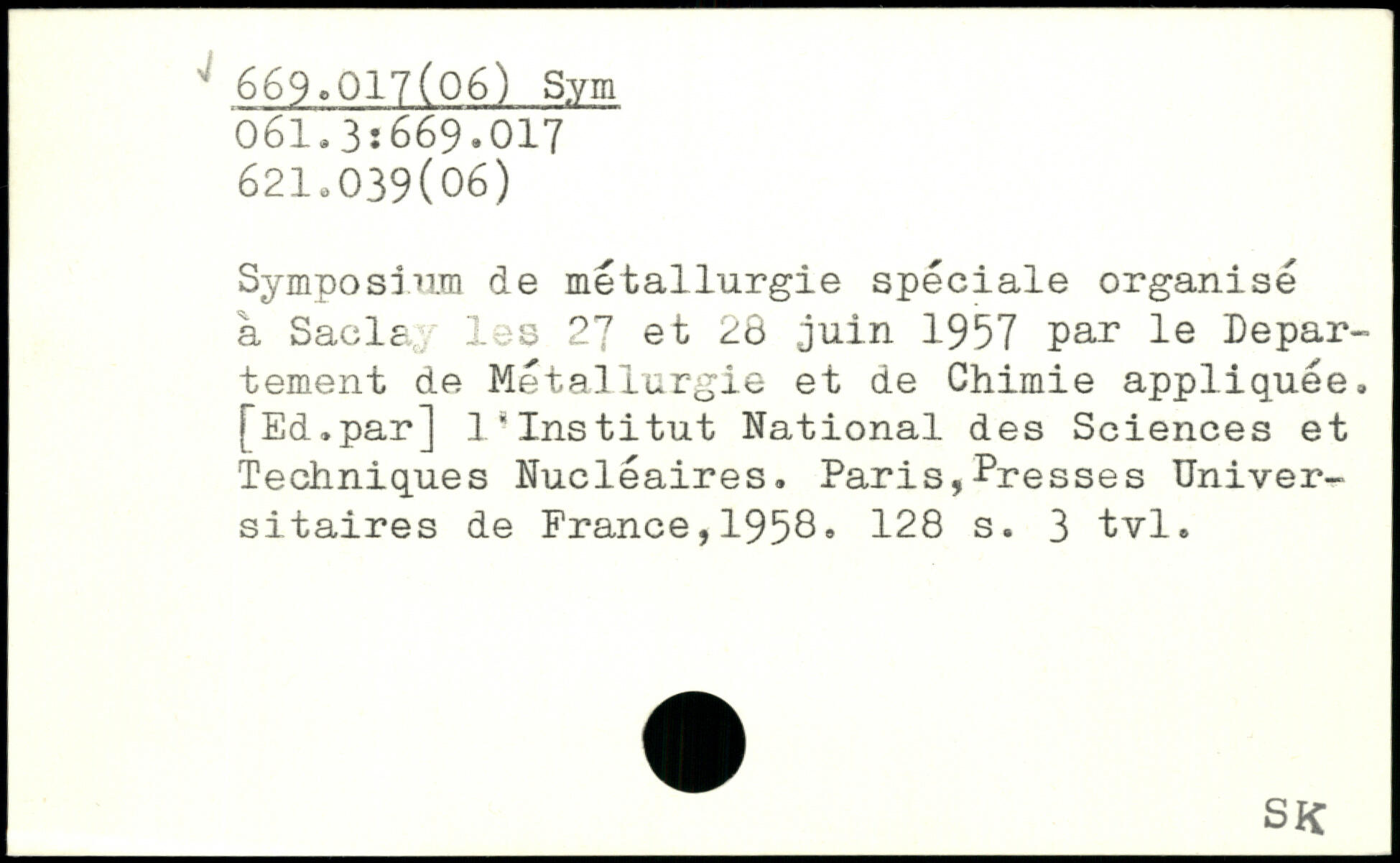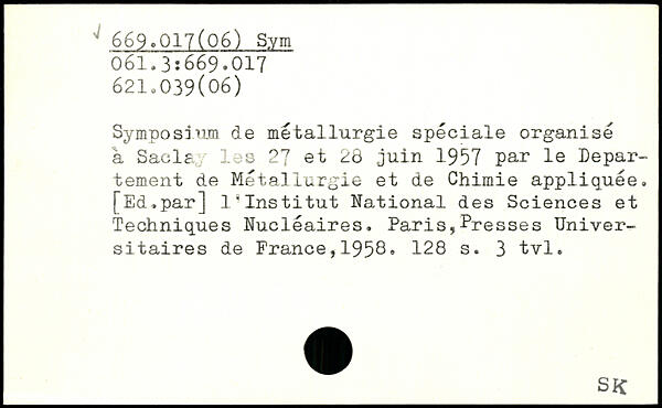 Symposium de métallurgie spéciale organisé à Sacla les 27 et 28 juin 1957 par le Departement de Métallurgie et de Chimie appliquée. [Ed.par] l'Institut National des Sciences et Techniques Nucléaires.