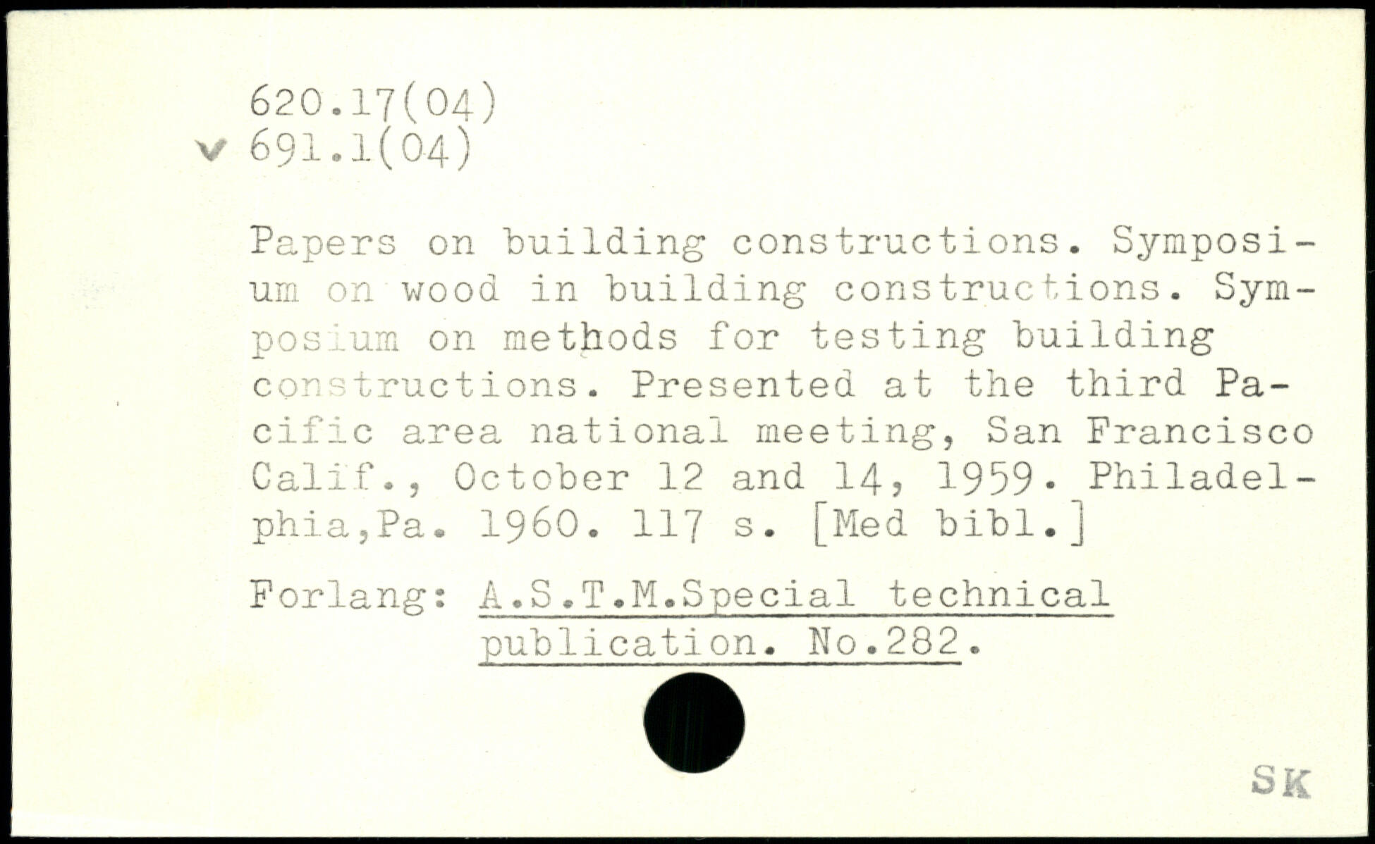 Papers on building construetions. Symposium on wood in building constructions. Symposium on methods for testing building constructions. Presented at the third Pacific area national meeting, San Francisco Calif., October 12 and 14? 1959. Philadelphia,Pa. 1960.