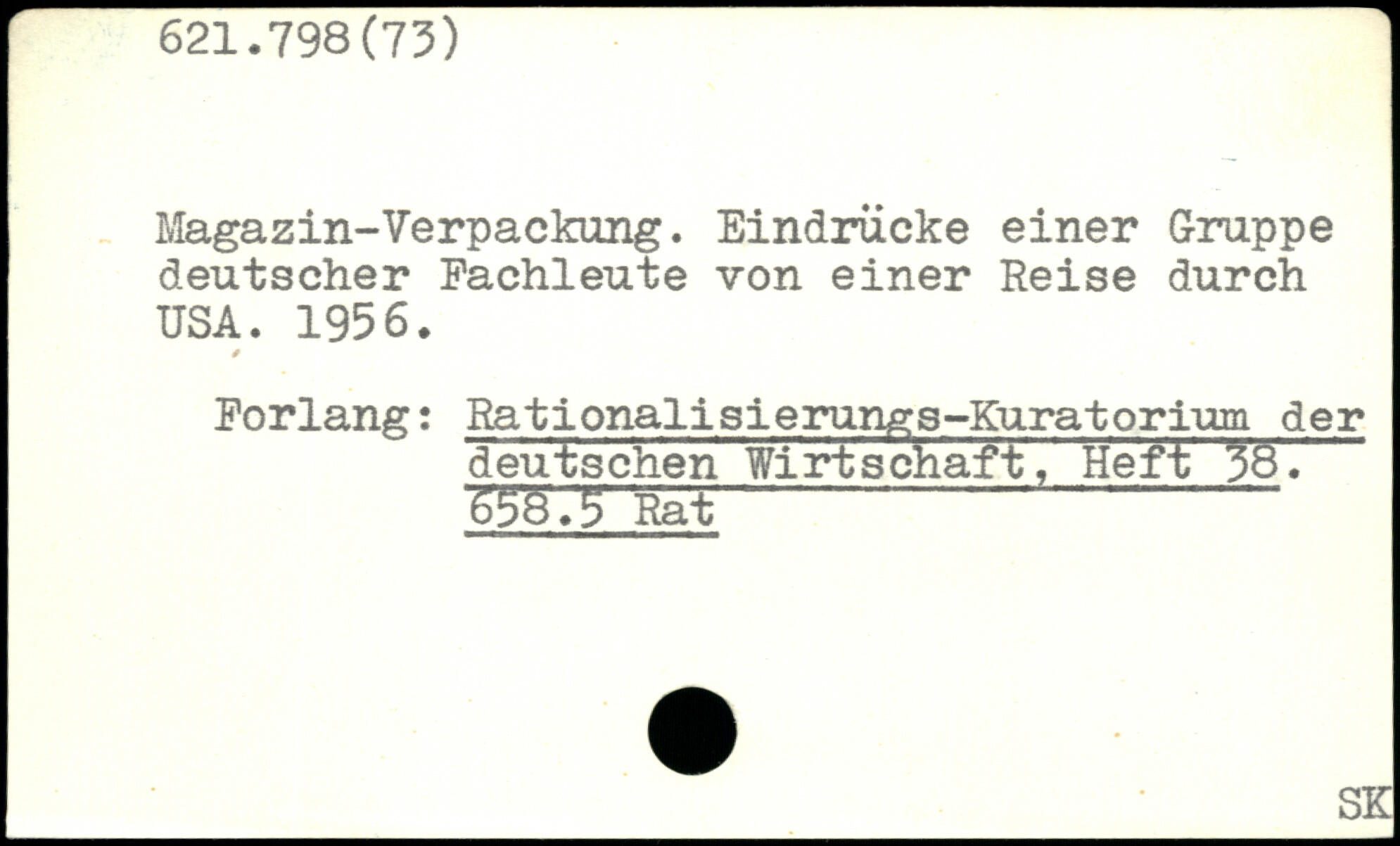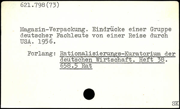 Magazin-Verpackung. Eindrücke einer Gruppe deutscher Fachleute von einer Reise durch USA. 1956. Forlang: Rationalisierungs-Kuratorium der deutschen Wirtschaft, Heft 38. "gSS/g Rat'- --