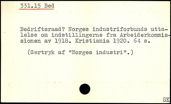 Bedriftsraad? Norges industriforbunds utta-lelse om indst1111ngerne fra Arbeiderkommis-sionen av 1918. Kristiania 1920.