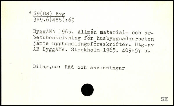 ByggAMA 1965. Allmän material- och arbetsbeskrivning for husbyggnadsarbeten jämte upphandlingsföreskrifter. Utg.av AB ByggAMA.