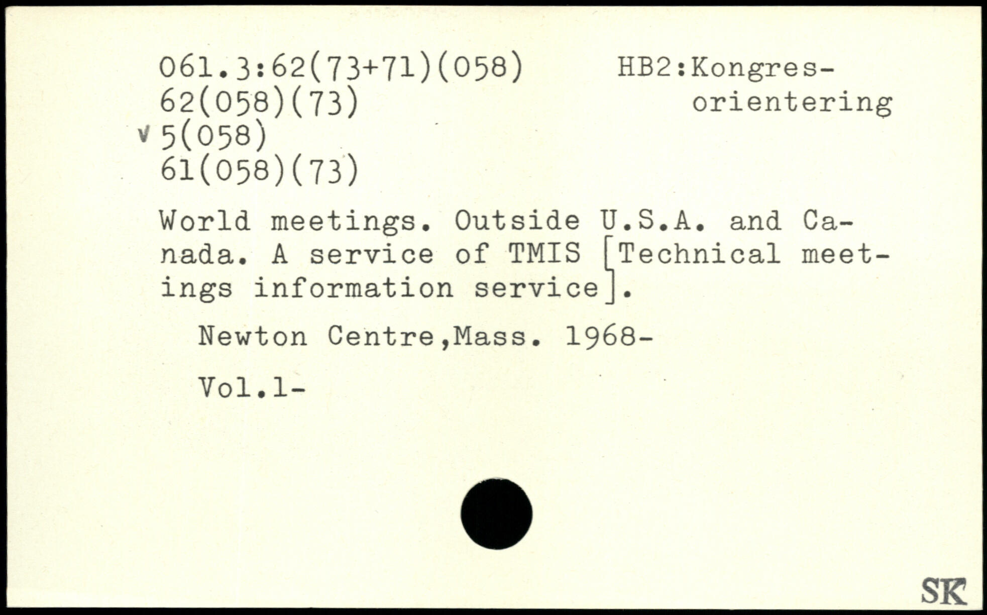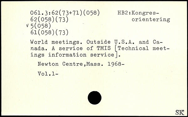 World, meetings. Outside U.S.A. and Canada. A service of TMIS [Technical meetings information service]. Newton Centre,Mass. 1968- Vol.l-