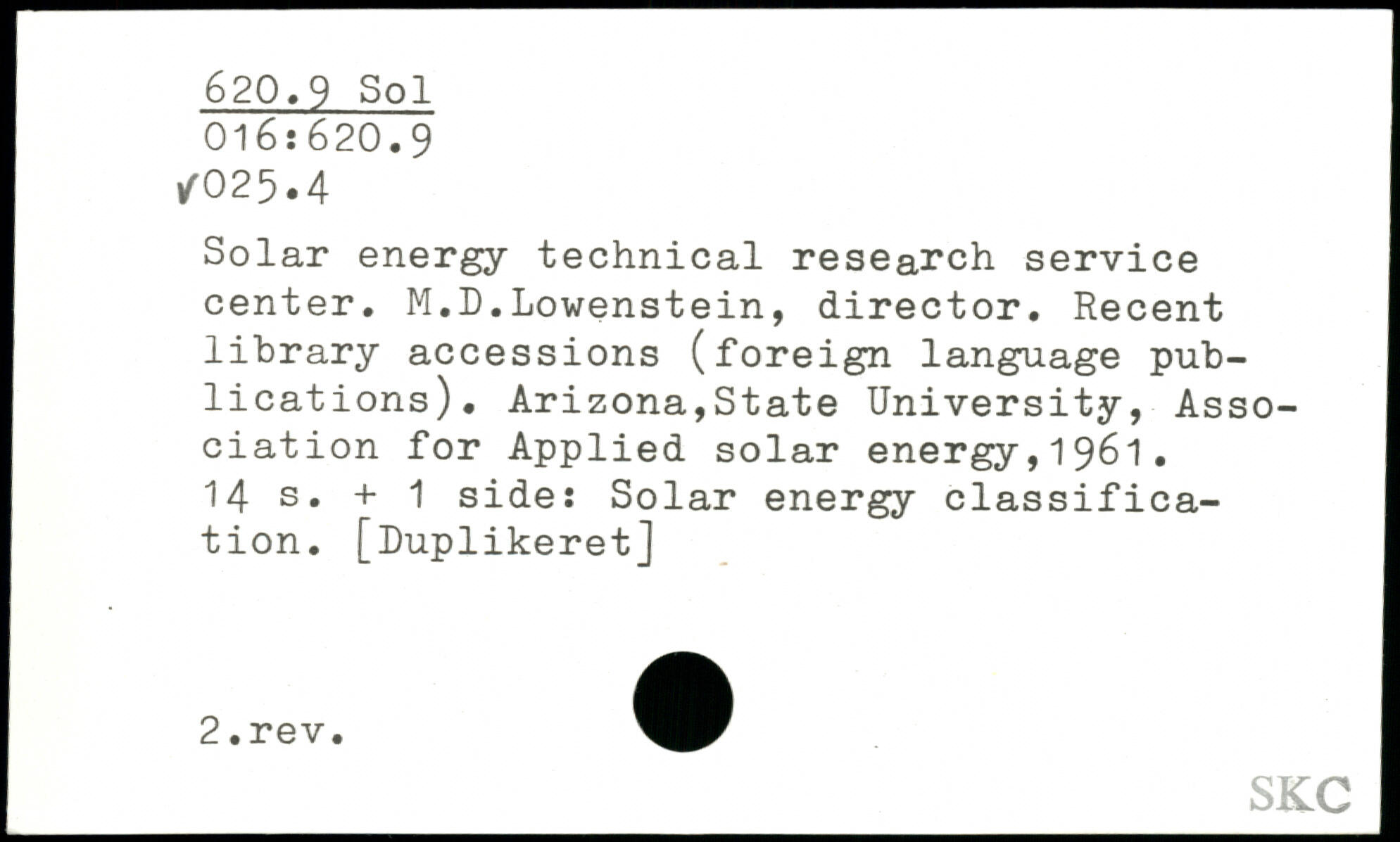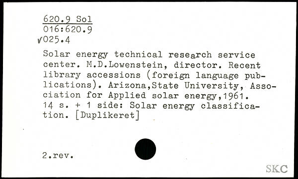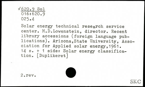 Solar energy technical research service center. M.D.Lowenstein, director. Recent library accessions (foreign language publications). Arizona,State University, Association for Applied solar energy,1961.