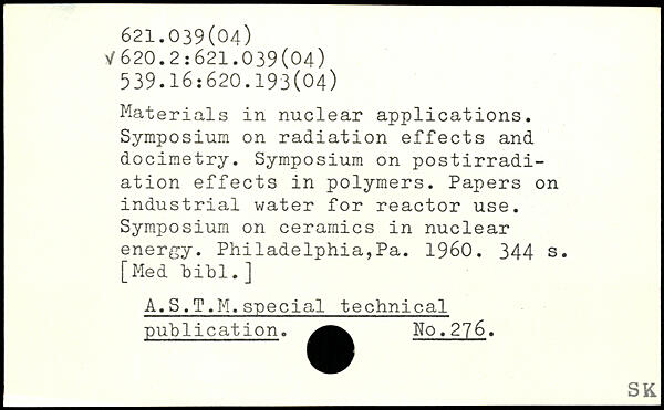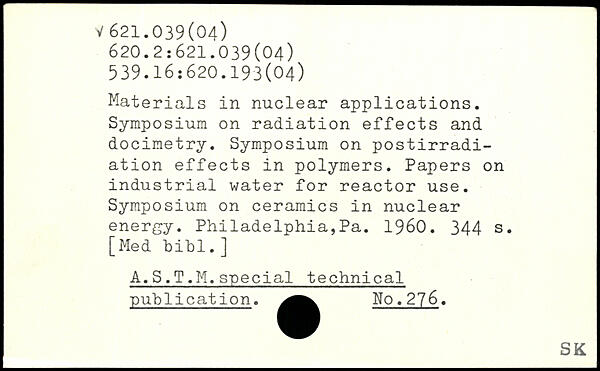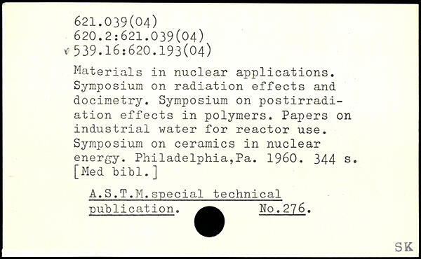 Materials in nuclear applications. Symposium on radiation effects and docimetry. Symposium on postirradiation effects in polymers. Papers on industrial water for reactor use. Symposium on ceramics in nuclear energy. Philadelphia,Pa. 1960.
