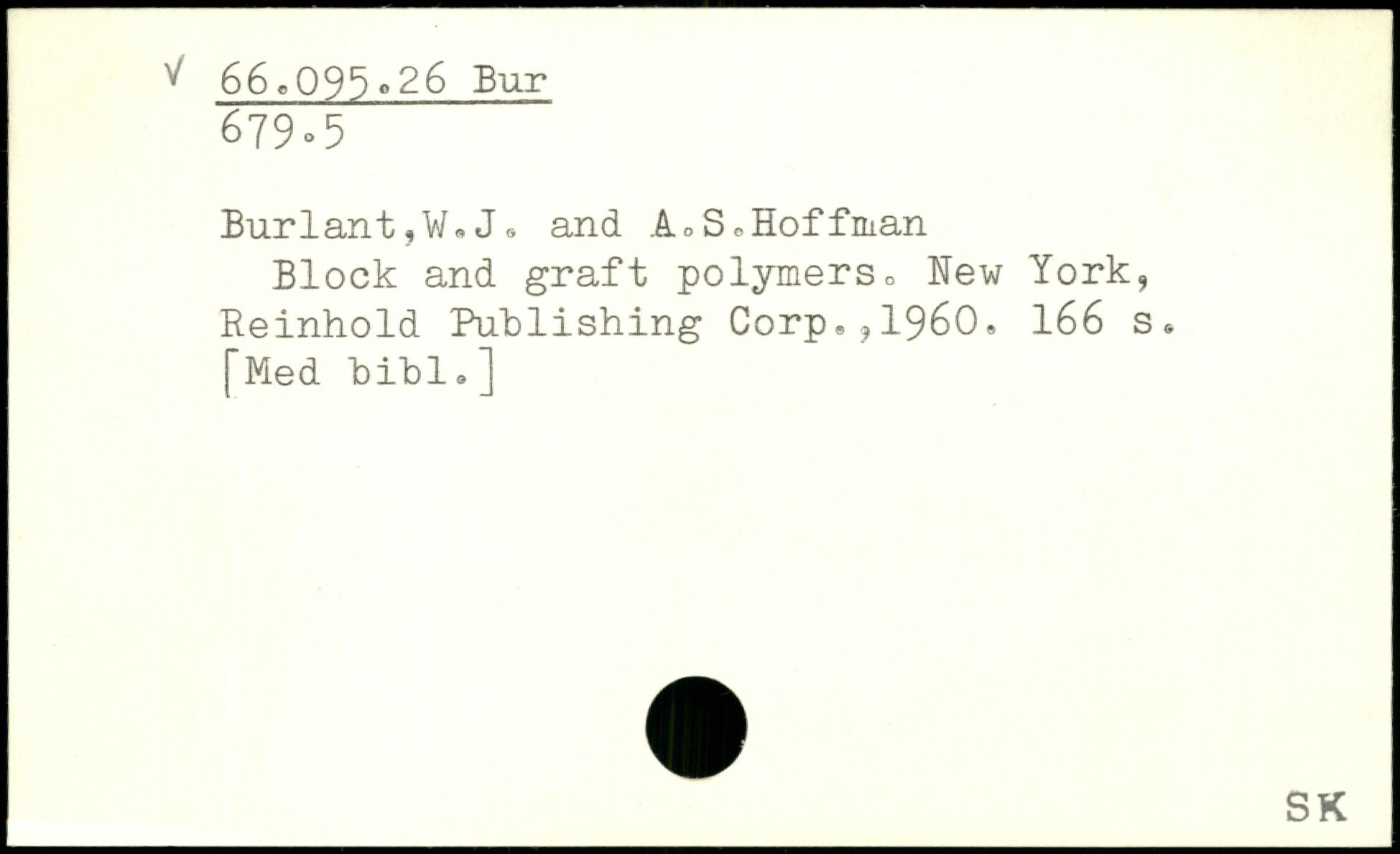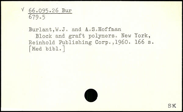 Burlant,W,Jo and A, Sc Hoffman Block and graft polymers, New York, Reinhold Publishing Corp,,1960.